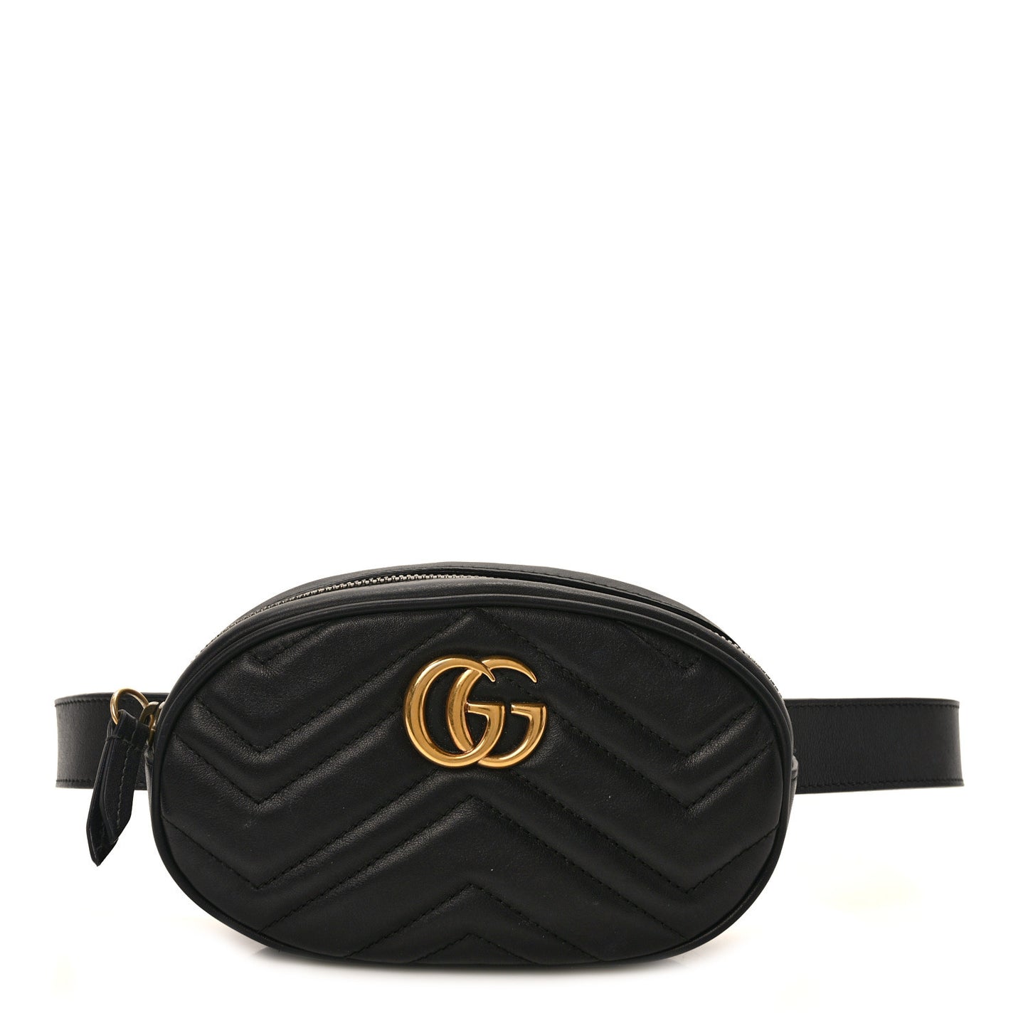 This is an authentic GUCCI Calfskin Matelasse GG Marmont Belt Bag size 85 or 34 in Black. This belt bag is crafted of chevron quilted leather in black. It features an aged gold GG logo on the front, a quilted heart on the back, and an adjustable belt strap. The bag opens to a light beige microfiber interior with a patch pocket.Follow this item for alerts. Gucci is a registered trademark of Gucci. FASHIONPHILE is not affiliated with Gucci.