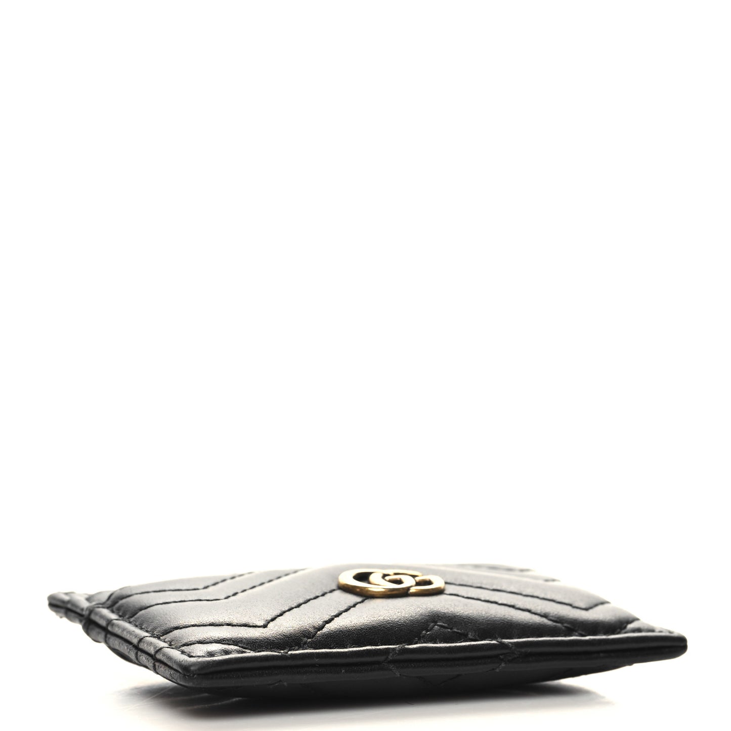 This is an authentic GUCCI Calfskin Matelasse GG Marmont Card Holder in Black. This stylish cardholder is crafted of chevron-quilted calfskin leather in black. It features an aged gold Gucci GG logo on the front and card slots on either side of the main compartment.Follow this item for alerts. Gucci is a registered trademark of Gucci. FASHIONPHILE is not affiliated with Gucci.