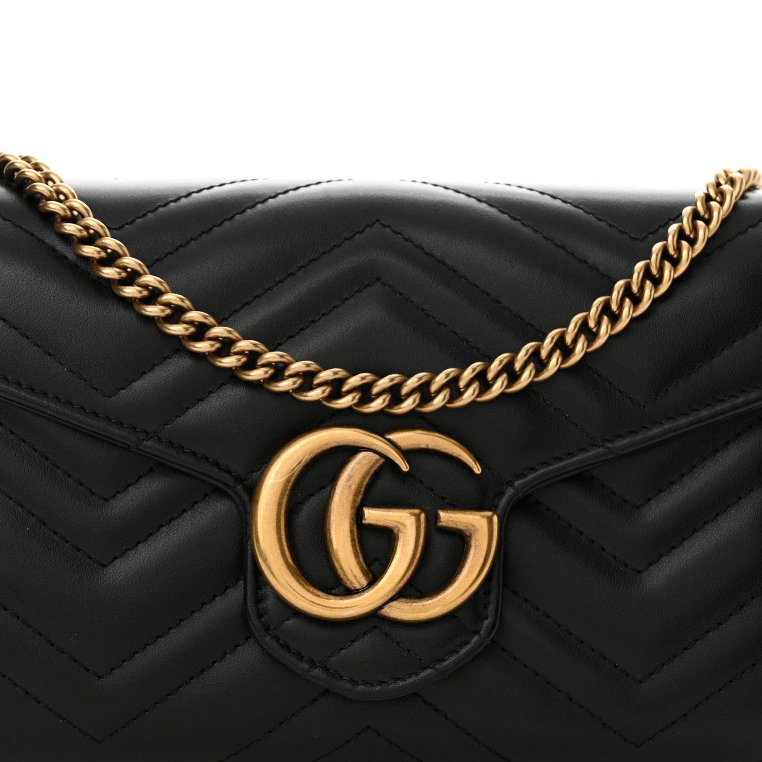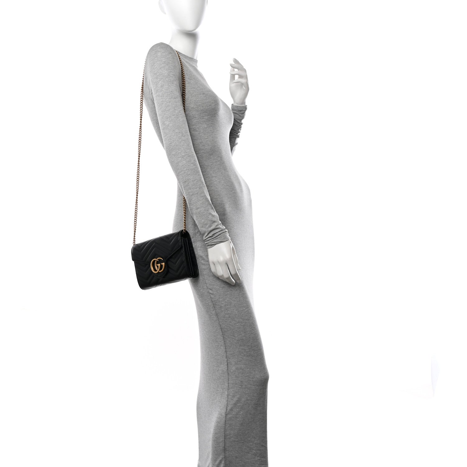 This is an authentic GUCCI Calfskin Matelasse GG Marmont Chain Wallet in Black. This chain wallet is made of soft chevron quilted calfskin leather in black. This crossbody features an optional long-aged gold chain-link shoulder strap and a crossover flap with an interlocking aged gold GG logo. The flap opens to a black leather interior with a zipper compartment and card slots.Follow this item for alerts. Gucci is a registered trademark of Gucci. FASHIONPHILE is not affiliated with Gucci.