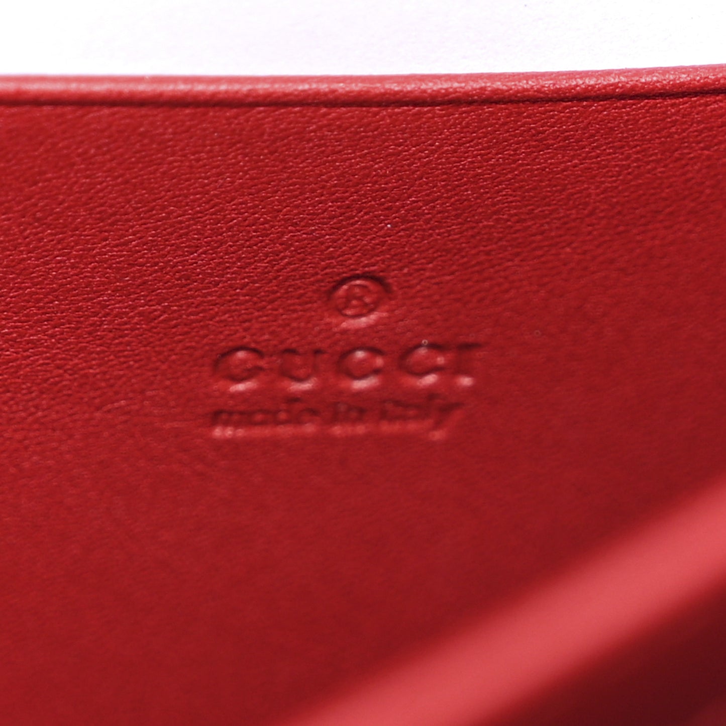 This is an authentic GUCCI Calfskin Matelasse Mini GG Marmont Chain Wallet in Hibiscus Red. This shoulder bag is made of soft chevron quilted calfskin leather in red. The shoulder bag features an optional long-aged gold chain link shoulder strap and a cross-over flap with an interlocking aged gold GG logo. This opens to a partitioned red leather and black fabric interior with a zipper compartment, patch pockets, and card slots.Follow this item for alerts. Gucci is a registered trademark of Gucci. FASHIONPHILE is not affiliated with Gucci.