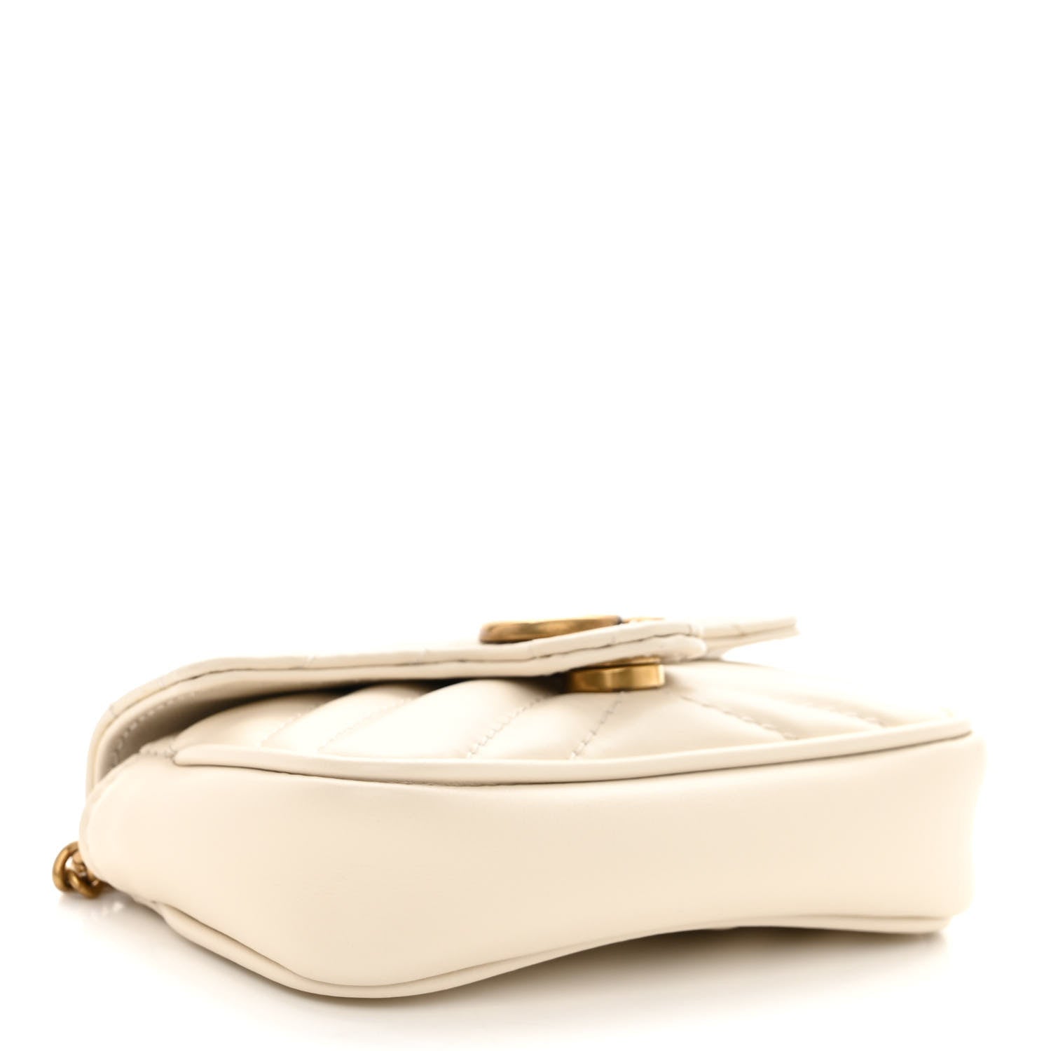 This is an authentic GUCCI Calfskin Matelasse Heart GG Marmont 2.0 Coin Purse On A Chain in Mystic White. This petite bag is crafted of smooth and supple white calfskin leather. The bag features an aged gold chain strap and a matching gold GG logo on the crossover flap. This opens to a compact beige interior. This mini bag is perfect for any time of the day, for casual or formal wear, from Gucci!