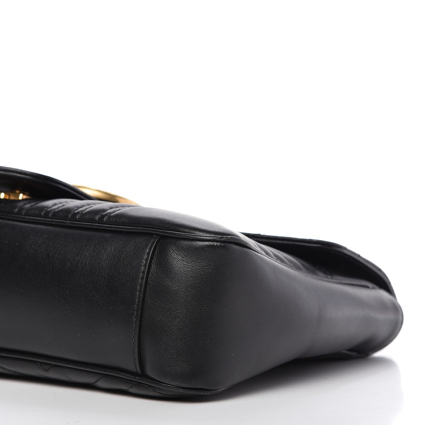 This is an authentic GUCCI Calfskin Matelasse Medium GG Marmont Shoulder Bag in Black. This shoulder bag is crafted of smooth quilted calfskin leather in classic black. The bag features an aged gold chain-link shoulder strap with a black leather shoulder pad. The front flap has a gold GG logo that opens with a press lock to a beige microfiber interior with zipper and patch pockets.Follow this item for alerts. Gucci is a registered trademark of Gucci. FASHIONPHILE is not affiliated with Gucci.