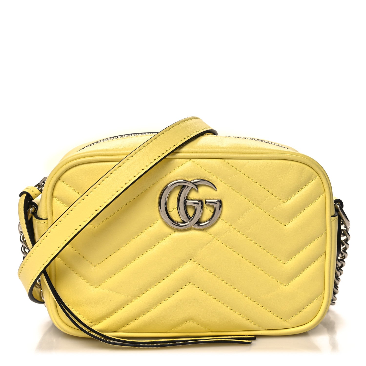 This is an authentic GUCCI Calfskin Matelasse Mini GG Marmont Chain Shoulder Bag in Banana. This shoulder bag is crafted of smooth and supple calfskin leather in yellow. This bag features a silver chain and leather shoulder strap and a front double G logo. The bag unzips to a beige suede interior with a patch pocket.Follow this item for alerts. Gucci is a registered trademark of Gucci. FASHIONPHILE is not affiliated with Gucci.