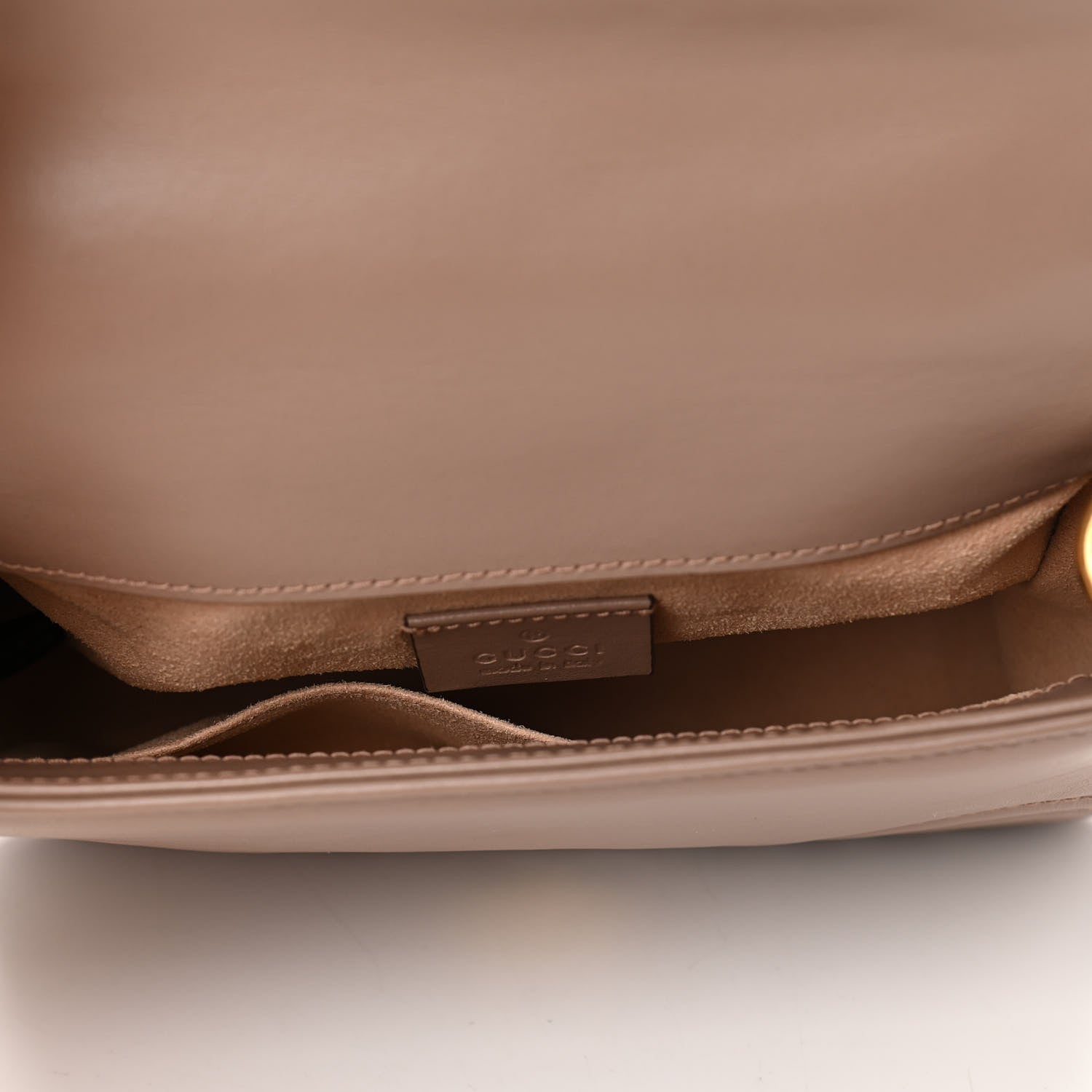 This is an authentic GUCCI Calfskin Matelasse Mini GG Marmont Top Handle Shoulder Bag Porcelain Rose. This shoulder bag is crafted of smooth and supple calfskin leather in beige. This bag features a leather top handle and a leather chain link shoulder strap. The front crossover flap features an interlocking GG logo that opens to a small beige interior with a patch pocket.Follow this item for alerts. Gucci is a registered trademark of Gucci. FASHIONPHILE is not affiliated with Gucci.