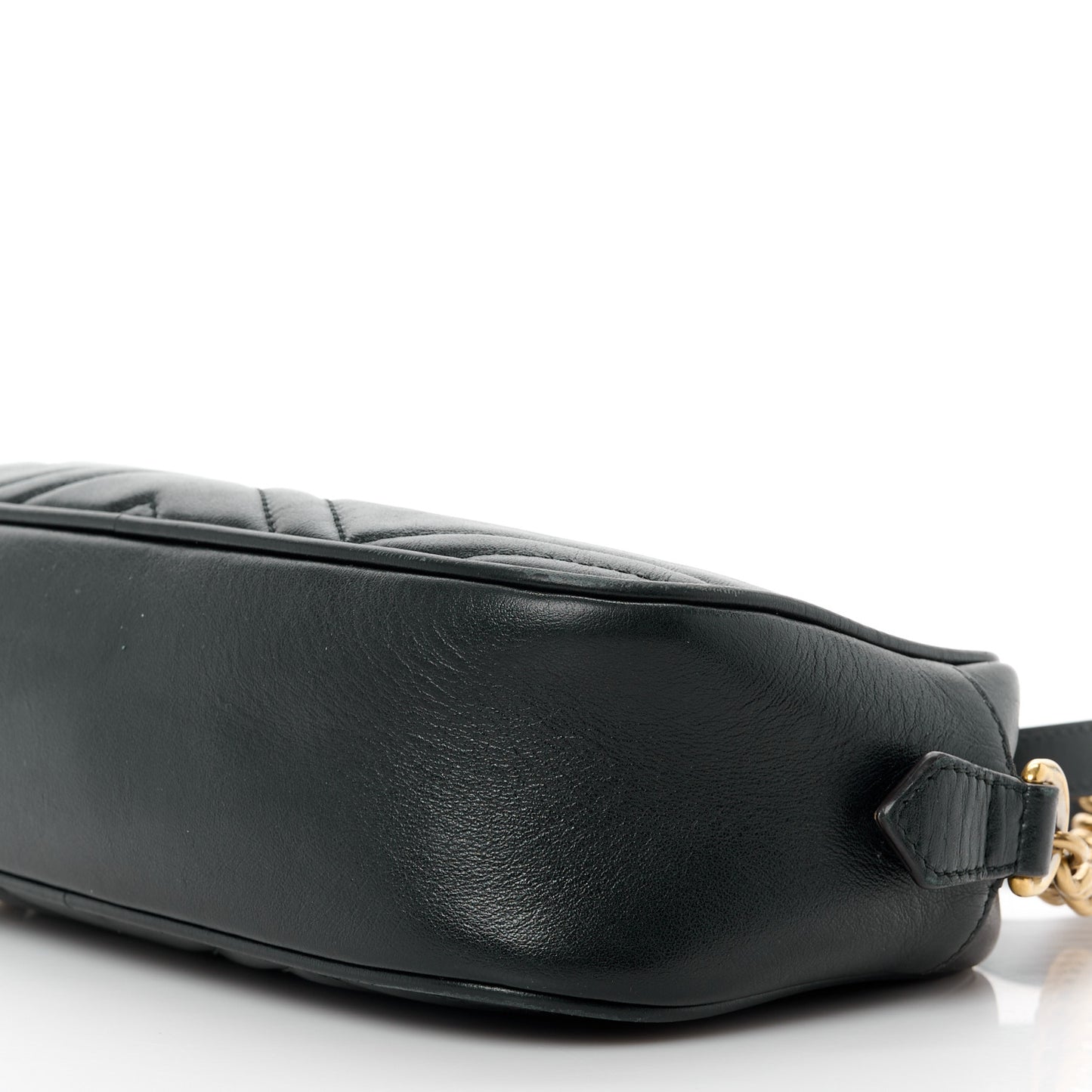 This is an authentic GUCCI Calfskin Matelasse Small GG Marmont Chain Shoulder Bag in Black. This shoulder bag is crafted of smooth and supple calfskin leather in black. This bag features an aged gold chain with a leather shoulder pad and a Gucci GG logo on the front. The top zipper opens to a beige microfiber interior with a black leather patch pocket.Follow this item for alerts. Gucci is a registered trademark of Gucci. FASHIONPHILE is not affiliated with Gucci.