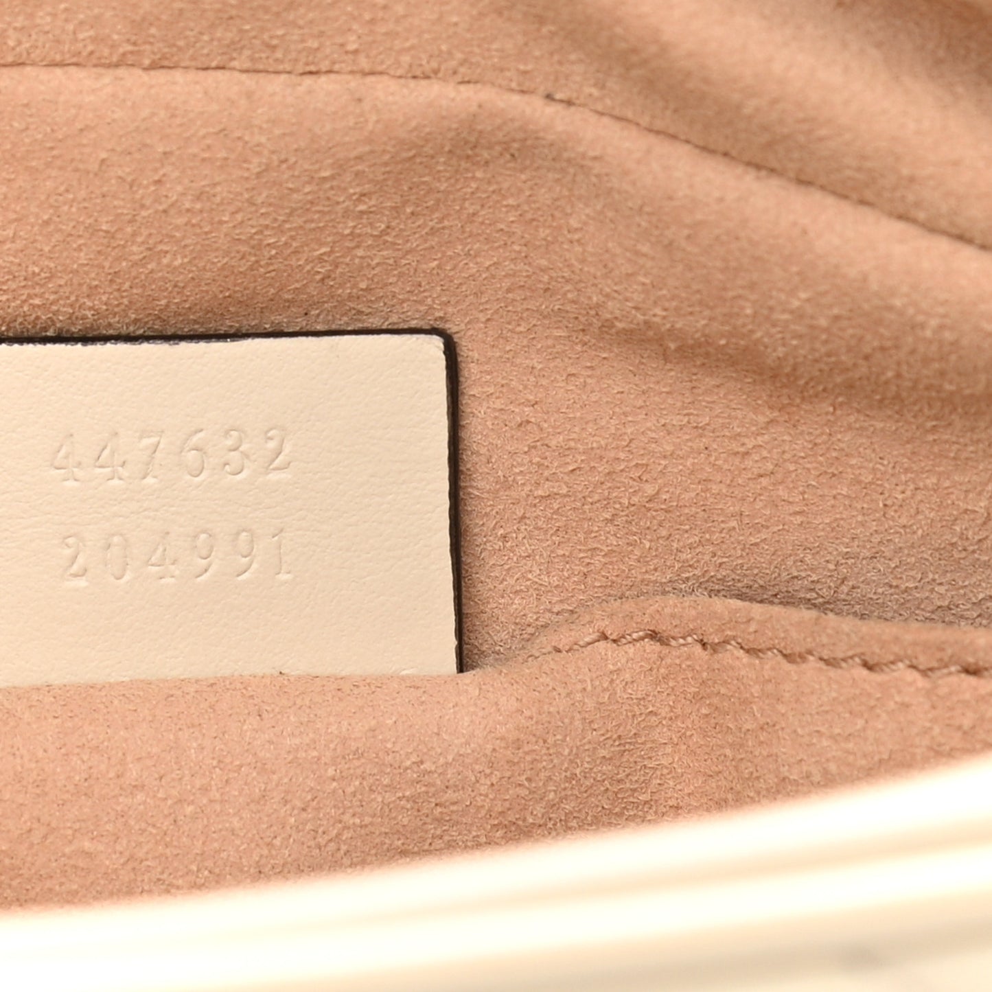 This is an authentic GUCCI Calfskin Matelasse Small GG Marmont Chain Shoulder Bag in White. This stylish handbag is made of soft calfskin leather in off white. This shoulder bag features an antiqued gold chain and leather shoulder strap, and a Gucci GG logo on the front. The top zipper opens to a beige suede interior with a patch pocket.Follow this item for alerts. Gucci is a registered trademark of Gucci. FASHIONPHILE is not affiliated with Gucci.
