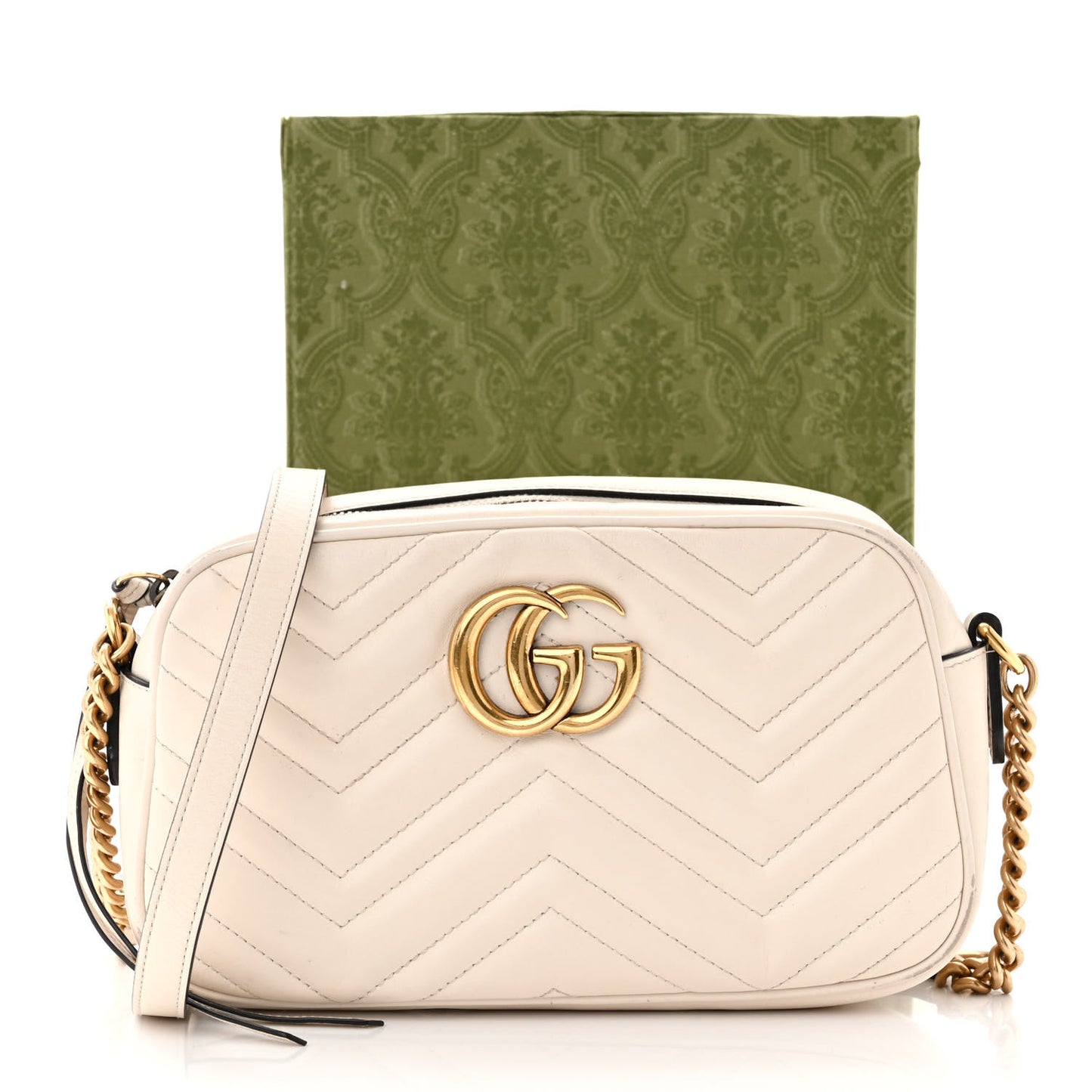 This is an authentic GUCCI Calfskin Matelasse Small GG Marmont Chain Shoulder Bag in White. This stylish shoulder bag is crafted of soft calfskin leather in off white. This shoulder bag features an antiqued gold chain and leather shoulder strap, and a Gucci GG logo on the front. The top zipper opens to a beige microfiber interior with a patch pocket.Follow this item for alerts. Gucci is a registered trademark of Gucci. FASHIONPHILE is not affiliated with Gucci.