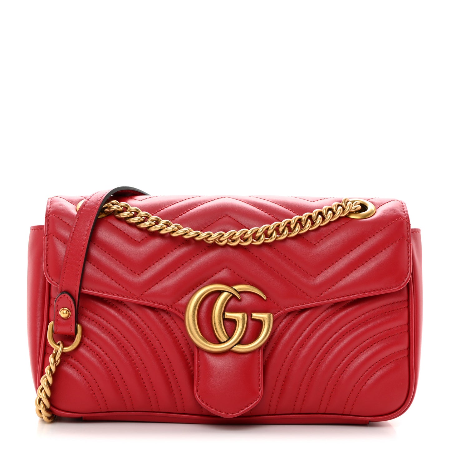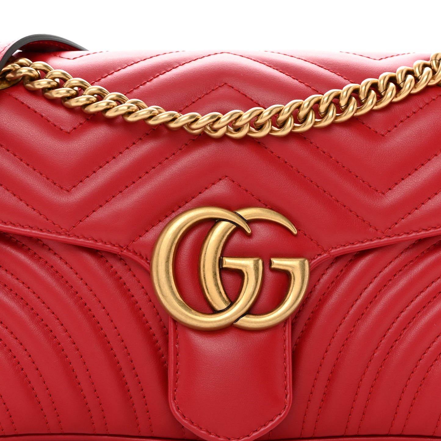 This is an authentic GUCCI Calfskin Matelasse Small GG Marmont Shoulder Bag in Hibiscus Red. This shoulder bag is crafted of smooth and supple calfskin leather in a classic red. This bag features an aged gold chain and leather shoulder strap and interlocking aged gold GG logo push lock. This opens to a beige microfiber interior with a zipper pocket.Follow this item for alerts. Gucci is a registered trademark of Gucci. FASHIONPHILE is not affiliated with Gucci.