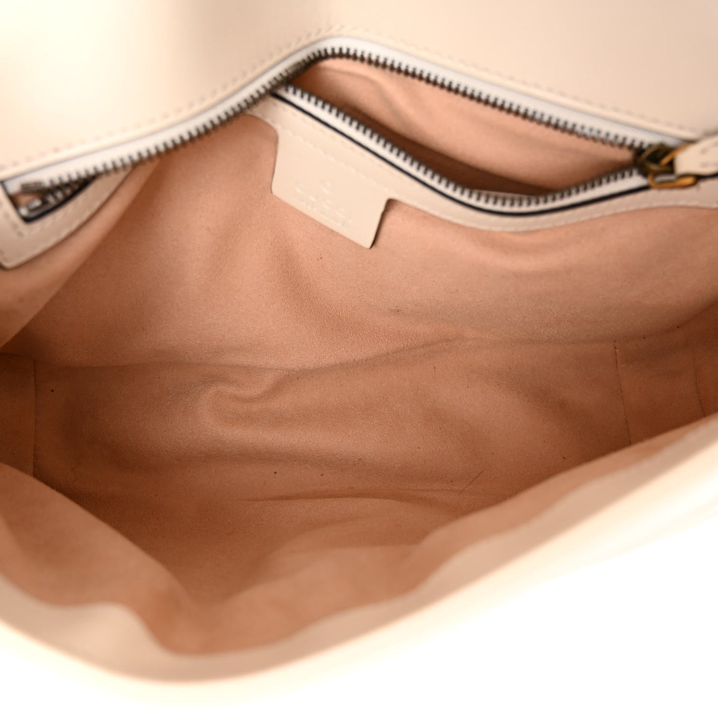 This is an authentic GUCCI Calfskin Matelasse Small GG Marmont Shoulder Bag in White. This stylish shoulder bag is crafted of calfskin leather in off white. The bag features an antiqued gold chain and leather shoulder strap and a Gucci GG logo on the front flap. The push lock under the front flap opens the bag to a beige microfiber interior with a patch pocket.