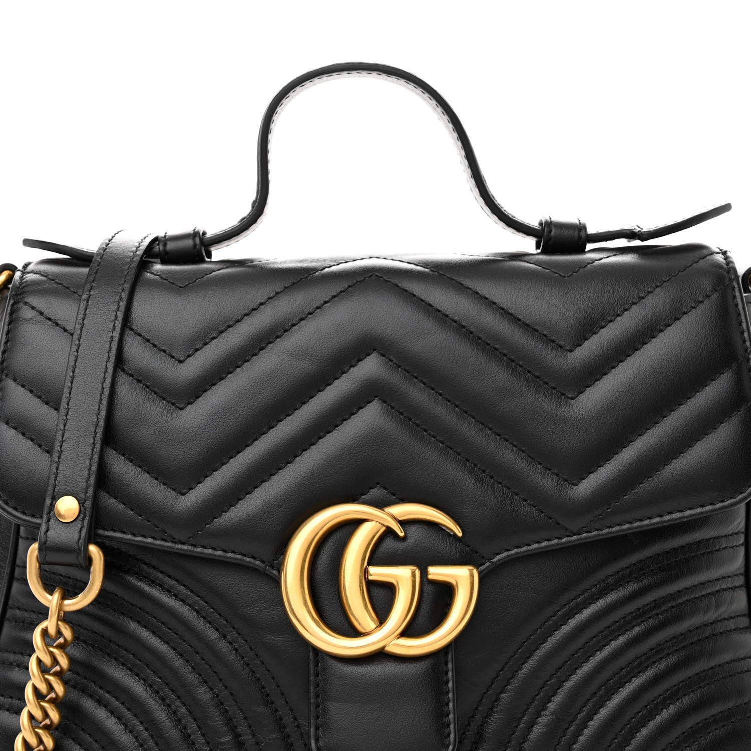 This is an authentic GUCCI Calfskin Matelasse Small GG Marmont Top Handle Shoulder Bag in Black. This shoulder bag is crafted of smooth and supple calfskin leather in black. This bag features a looping leather top handle, an aged gold chain shoulder strap, and a gold GG logo on the front. The bag opens to a beige microfiber interior with zipper and patch pockets.Follow this item for alerts. Gucci is a registered trademark of Gucci. FASHIONPHILE is not affiliated with Gucci.