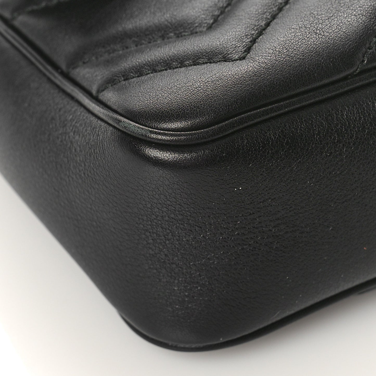 This is an authentic GUCCI Calfskin Matelasse Super Mini GG Marmont Shoulder Bag in Black. This bag is crafted of smooth calfskin leather in classic black with quilted chevron stitching. This bag features an optional aged-gold chain shoulder strap and an interlocking aged-gold GG logo on the front. The flap opens to a beige fabric interior with a key ring.Follow this item for alerts. Gucci is a registered trademark of Gucci. FASHIONPHILE is not affiliated with Gucci.