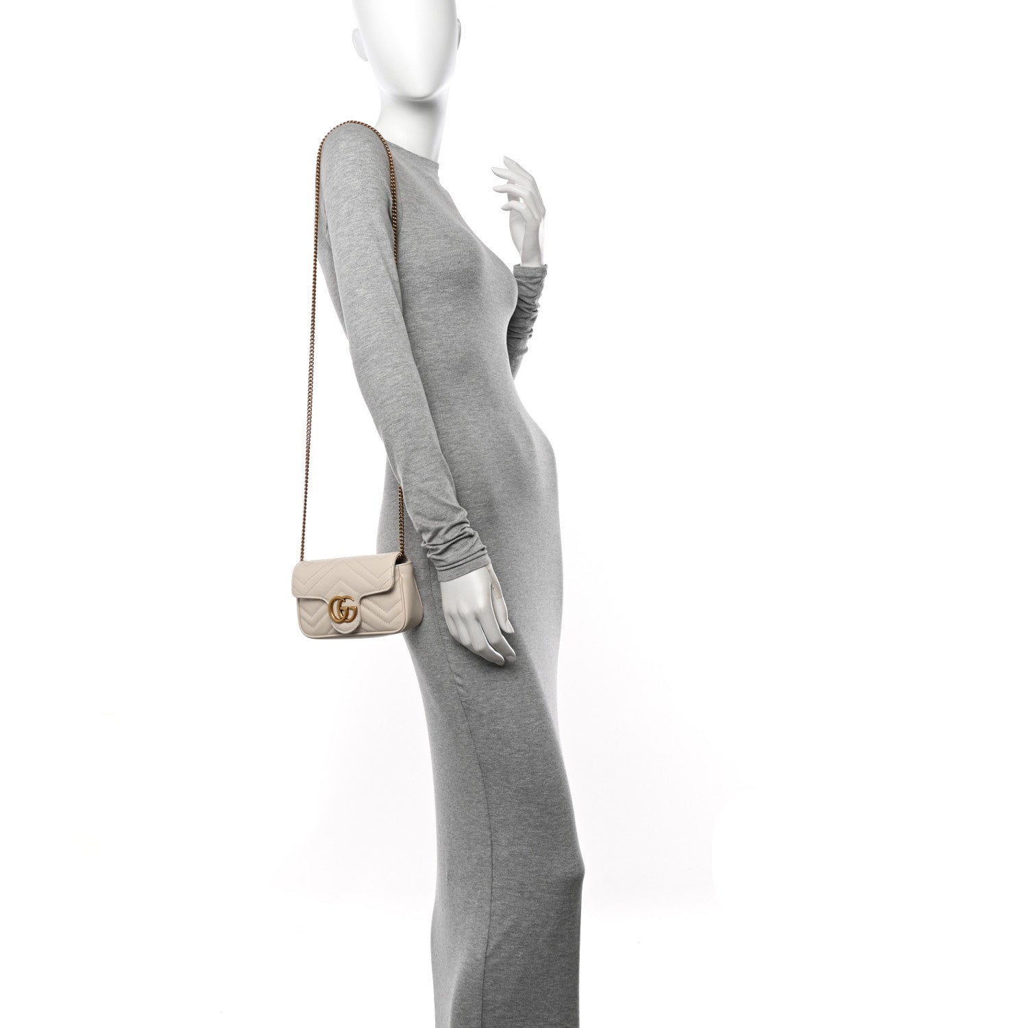 This is an authentic GUCCI Calfskin Matelasse Super Mini GG Marmont Shoulder Bag in White. This shoulder bag is crafted of smooth and supple calfskin leather in white. This bag features an aged gold chain shoulder strap and a front flap that features an aged gold GG logo that opens to a light beige fabric interior and a removable key ring.Follow this item for alerts. Gucci is a registered trademark of Gucci. FASHIONPHILE is not affiliated with Gucci.