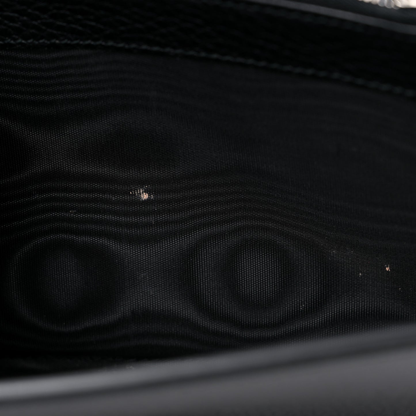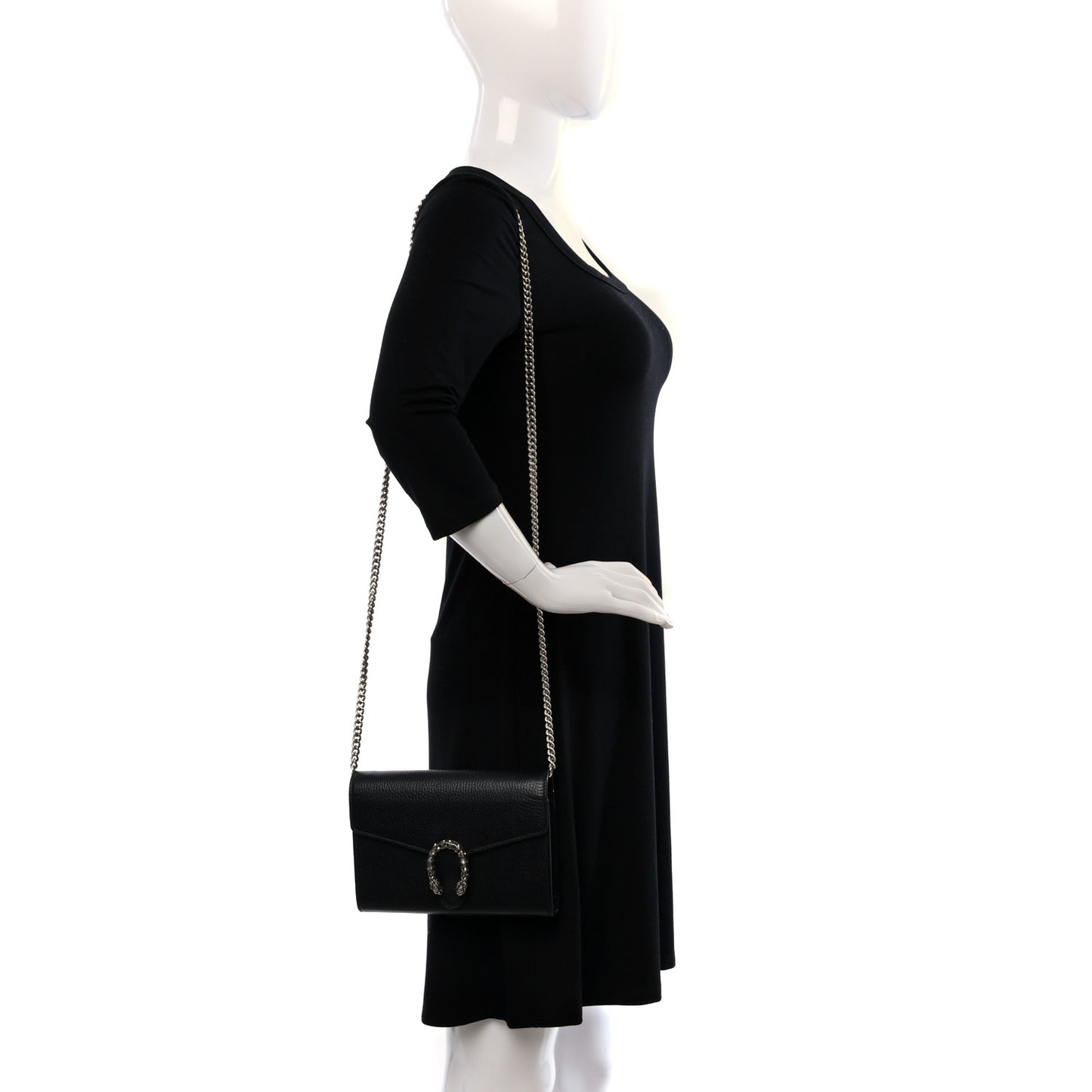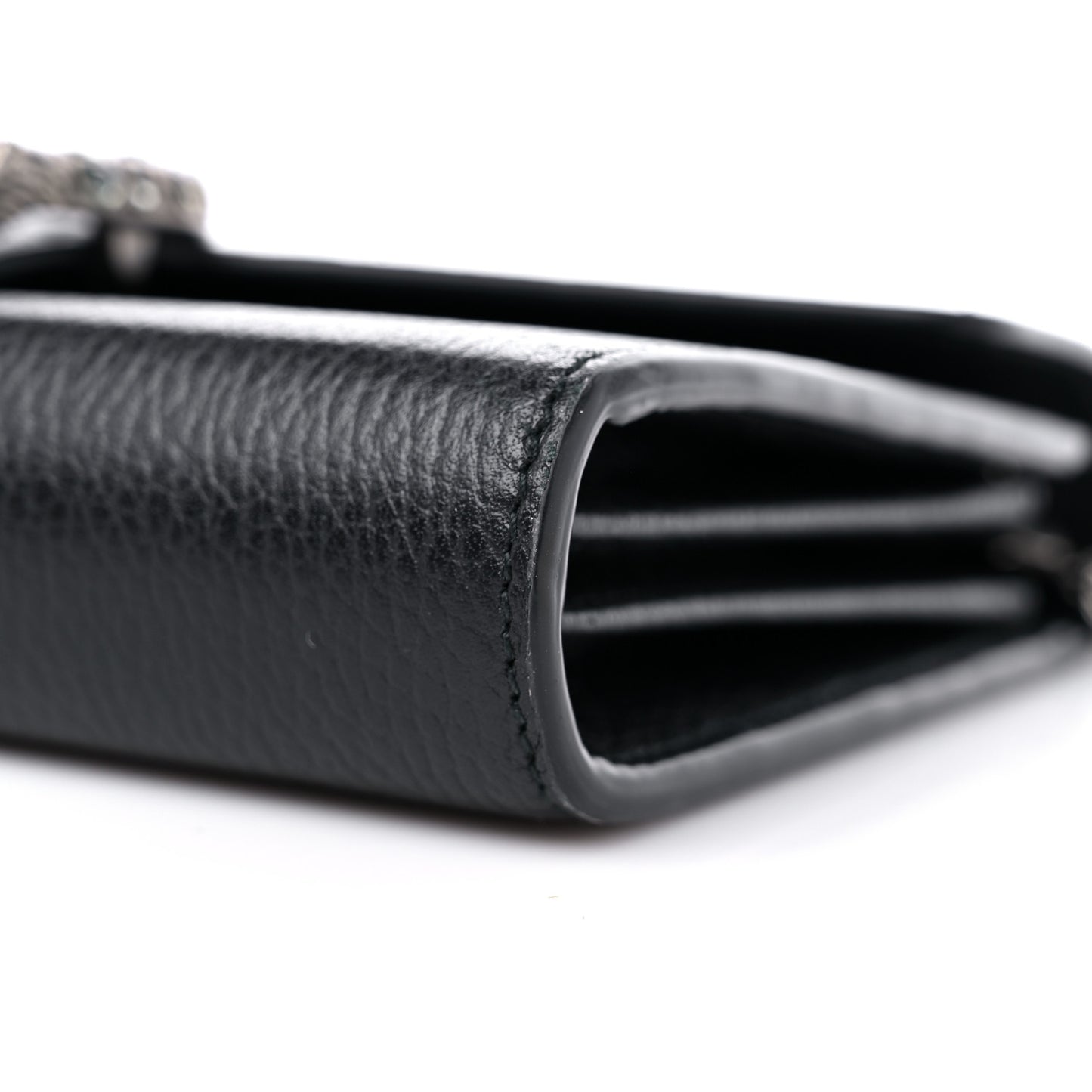 This is an authentic GUCCI Calfskin Mini Dionysus Chain Wallet in Black. This stylish bag is crafted of grained calfskin leather in black. The bag features an optional silver chain shoulder strap and a crystal-encrusted horseshoe closure with tiger head spurs. This opens to a partitioned black leather and fabric interior with card slots, patch pockets and a zipper compartment.Follow this item for alerts. Gucci is a registered trademark of Gucci. FASHIONPHILE is not affiliated with Gucci.