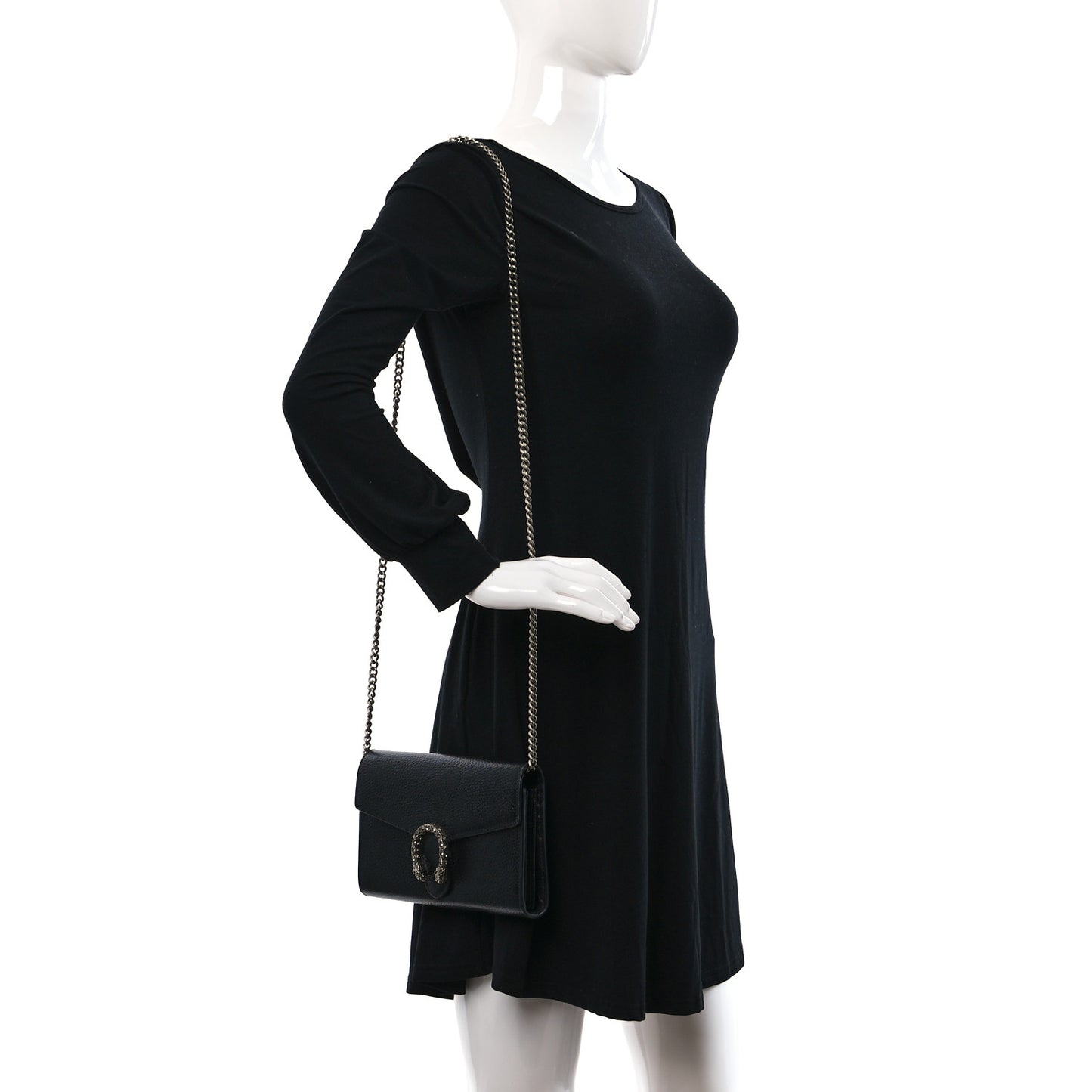 This is an authentic GUCCI Calfskin Mini Dionysus Chain Wallet in Black. This stylish bag is crafted of grained calfskin leather in black. The bag features an optional silver chain shoulder strap and a crystal-encrusted horseshoe closure with tiger head spurs. This opens to a partitioned black leather and fabric interior with card slots, patch pockets, and a zipper compartment.Follow this item for alerts. Gucci is a registered trademark of Gucci. FASHIONPHILE is not affiliated with Gucci.