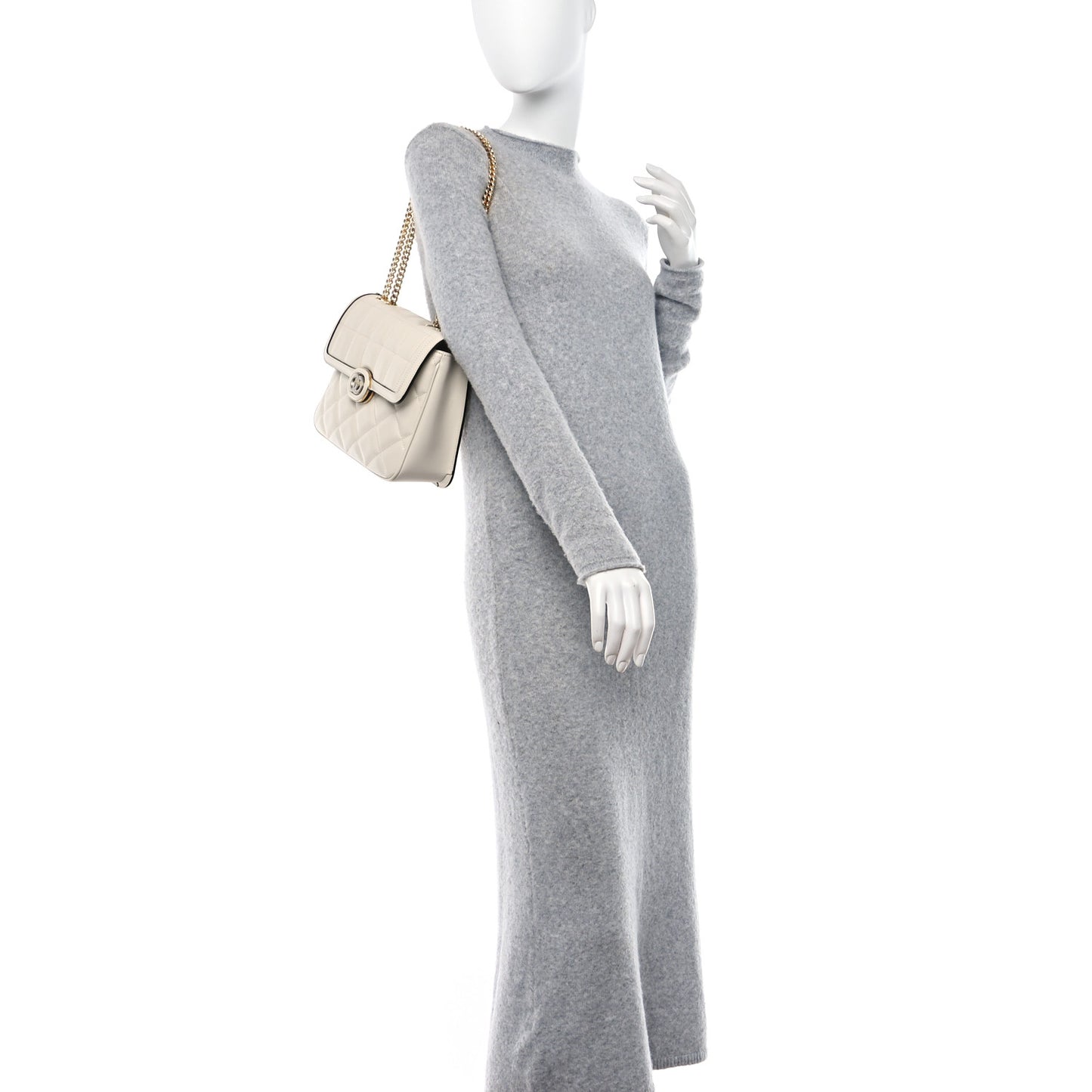 This is an authentic GUCCI Calfskin Quilted Small Deco Shoulder Bag in Mystic White. This shoulder bag is crafted of smooth, quilted calfskin leather in white. It features a gold chain strap and two-toned vintage interlocking G on the front flap. This opens to a smooth leather interior with a zipper pocket.Follow this item for alerts. Gucci is a registered trademark of Gucci. FASHIONPHILE is not affiliated with Gucci.