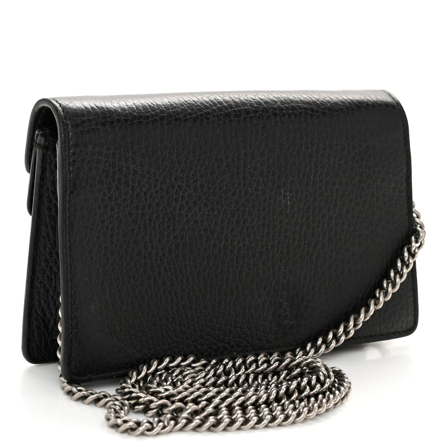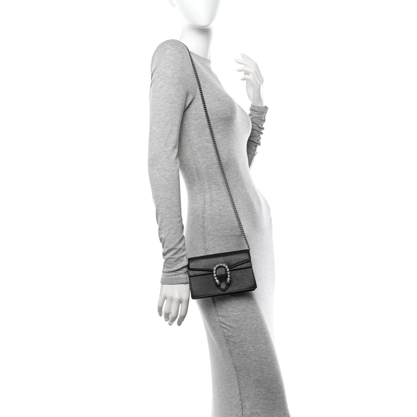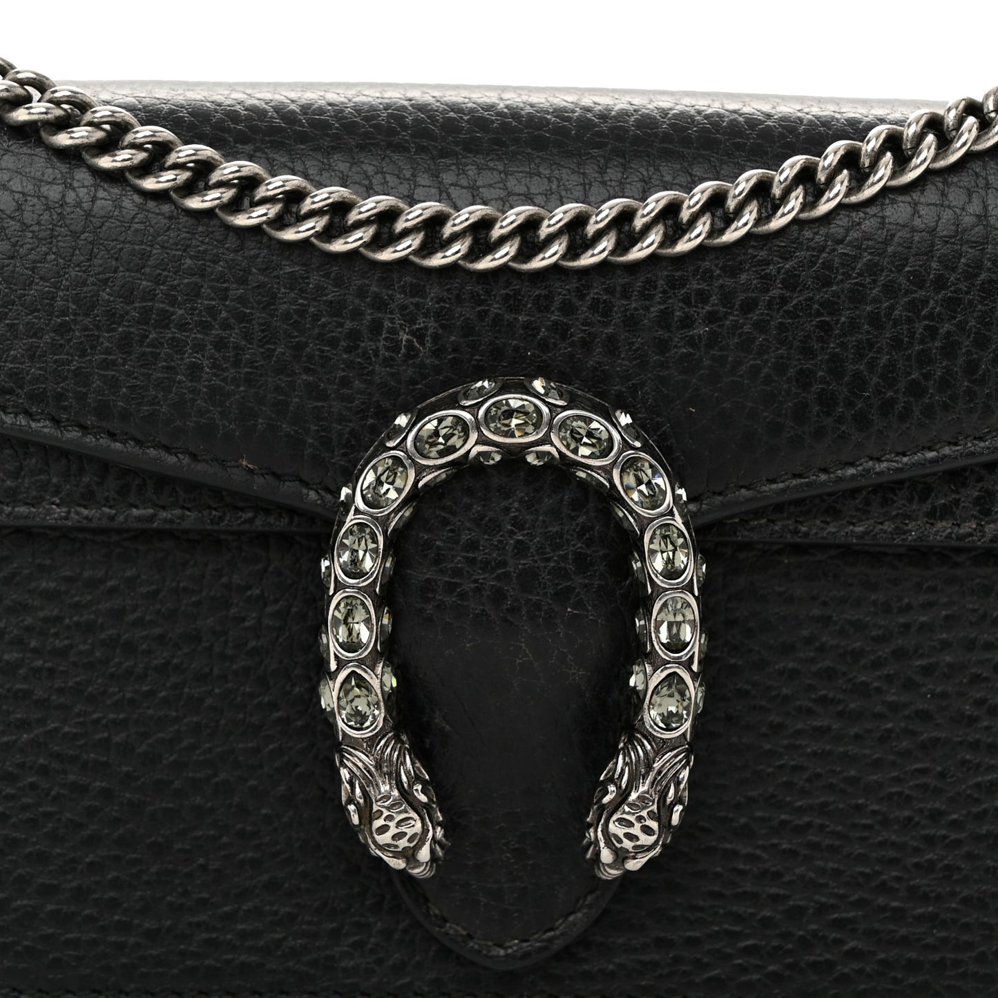 This is an authentic GUCCI Calfskin Super Mini Dionysus Shoulder Bag in Black. This petite bag is crafted of beautifully grained calfskin in black. This shoulder bag features an aged silver chain shoulder strap and a textured horseshoe tiger spur closure encrusted with crystals. The double flap opens to a beige suede interior.Follow this item for alerts. Gucci is a registered trademark of Gucci. FASHIONPHILE is not affiliated with Gucci.