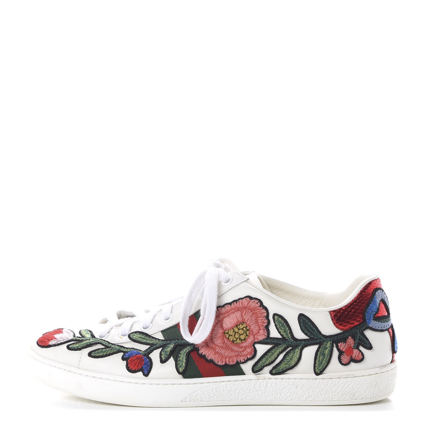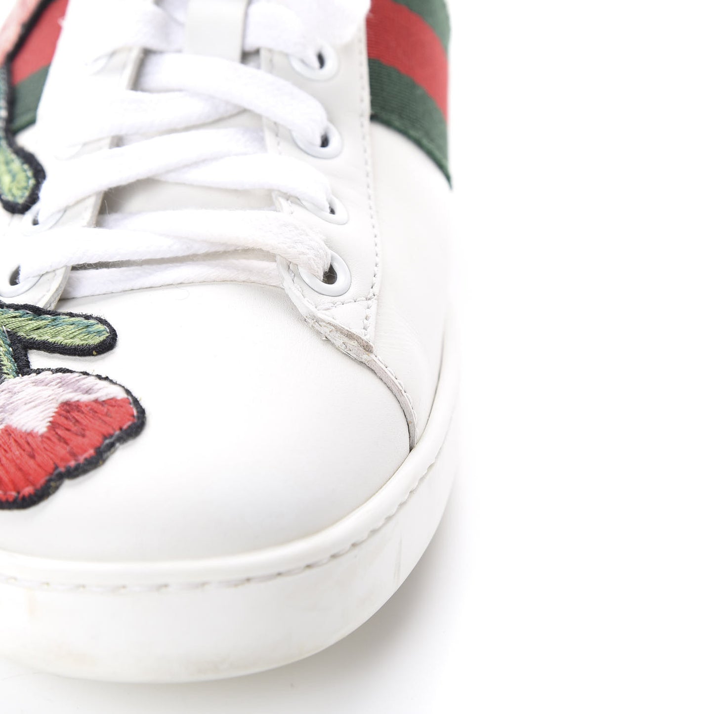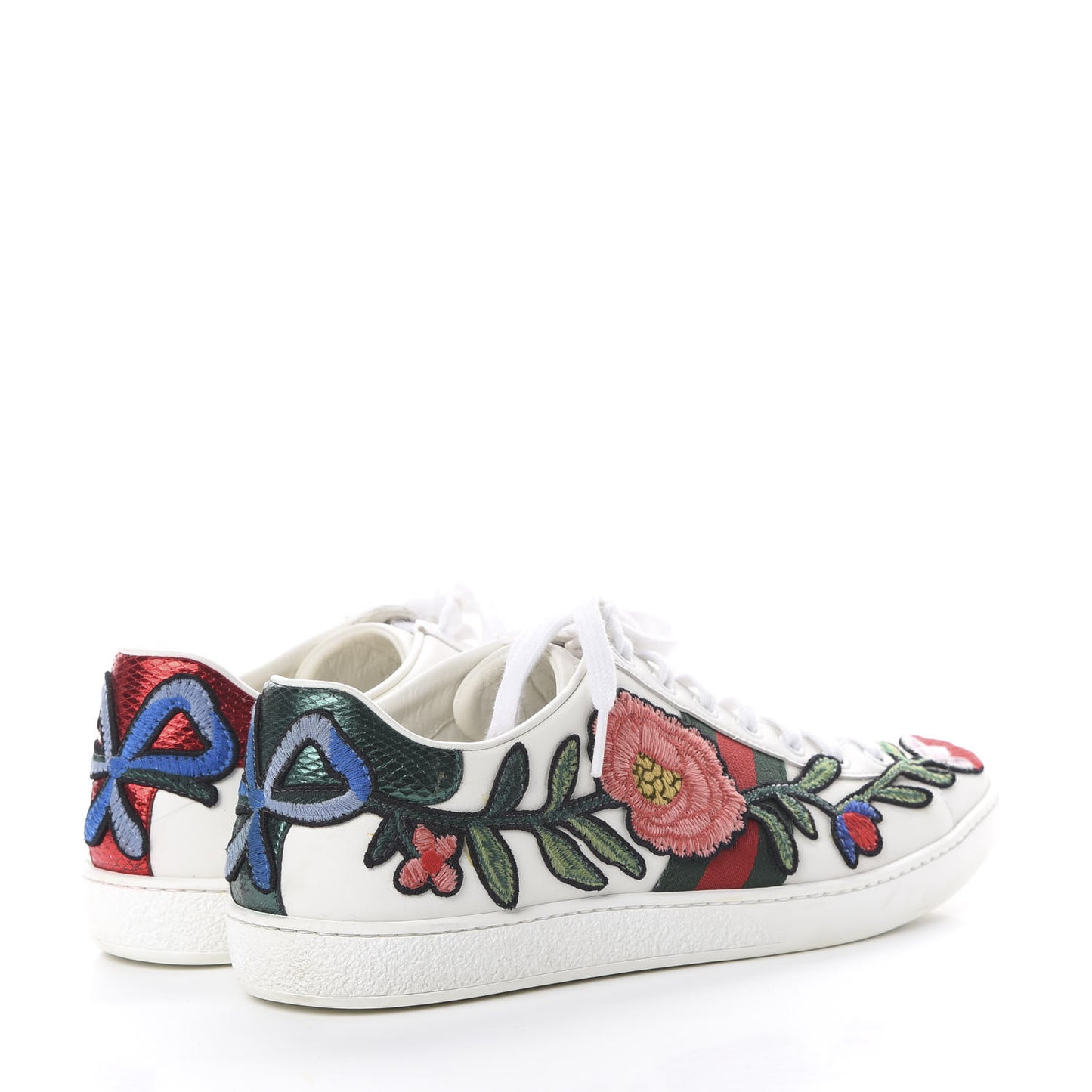 This is an authentic pair of GUCCI Calfskin Web Floral Embroidered Women's Ace Sneakers in 39.5 in White. These stylish sneakers are crafted of white leather with a stunning floral pattern. They feature white laces, red and green snakeskin-embossed panels with blue bows and white rubber soles. These are chic sneakers, with the distinctive look from Gucci!Follow this item for alerts. Gucci is a registered trademark of Gucci. FASHIONPHILE is not affiliated with Gucci.