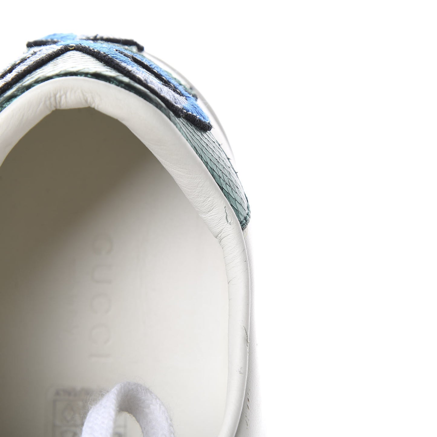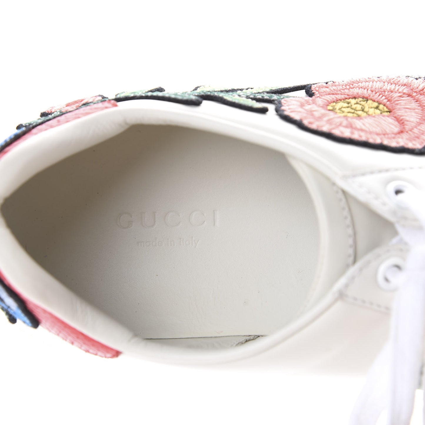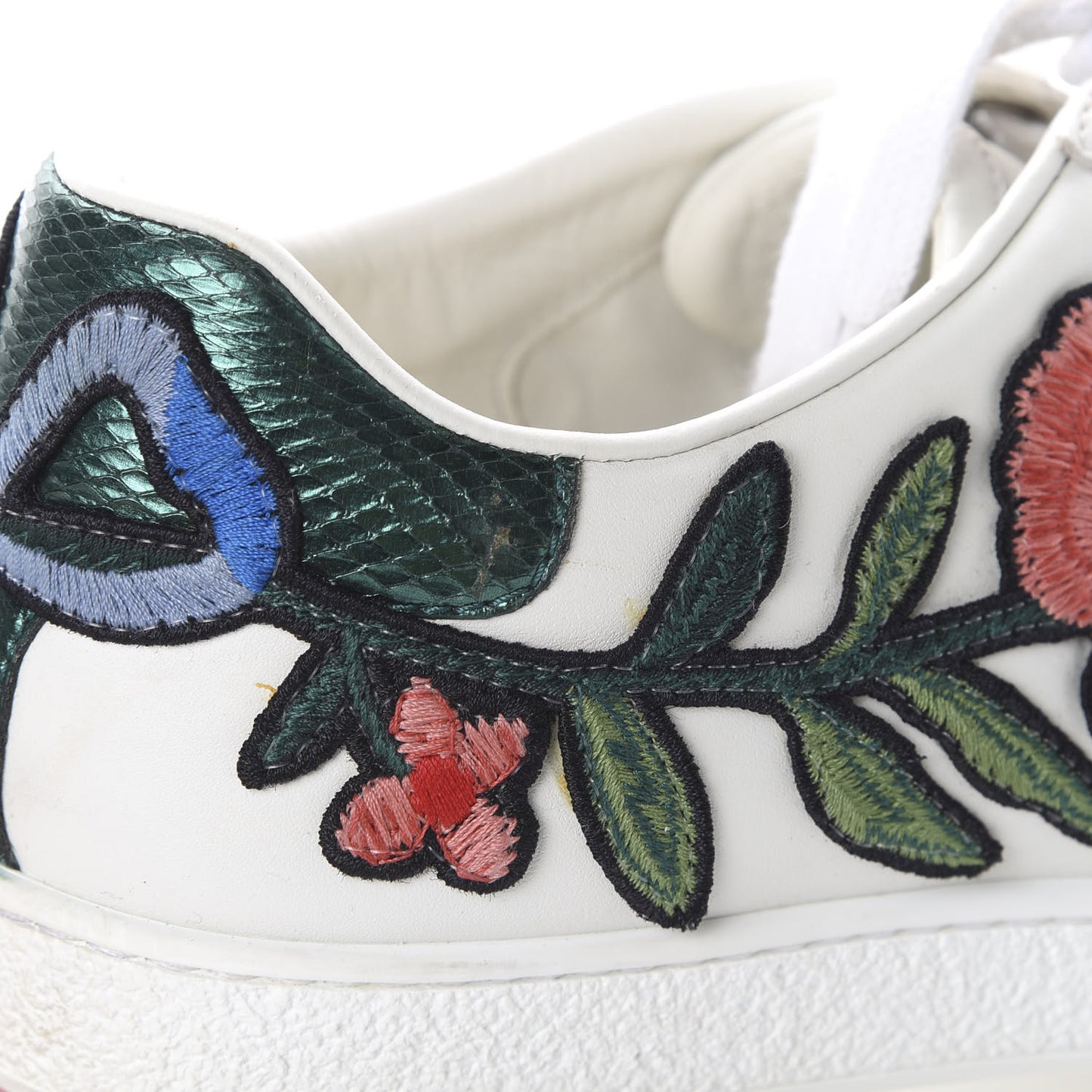 This is an authentic pair of GUCCI Calfskin Web Floral Embroidered Women's Ace Sneakers in 39.5 in White. These stylish sneakers are crafted of white leather with a stunning floral pattern. They feature white laces, red and green snakeskin-embossed panels with blue bows and white rubber soles. These are chic sneakers, with the distinctive look from Gucci!Follow this item for alerts. Gucci is a registered trademark of Gucci. FASHIONPHILE is not affiliated with Gucci.