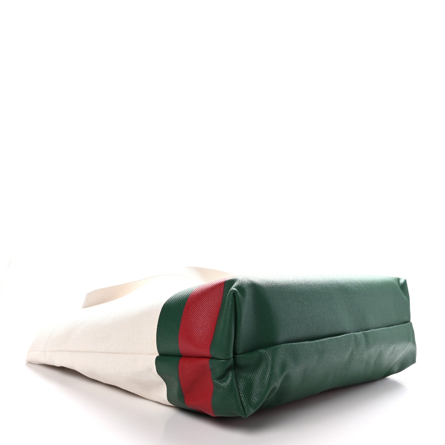 This is an authentic GUCCI Canvas Logo Embossed Ophidia Tote in Beige. This stylish tote is finely crafted of canvas in beige and features red and green web striping. The top is open to a fabric interior and large zipper pocket.