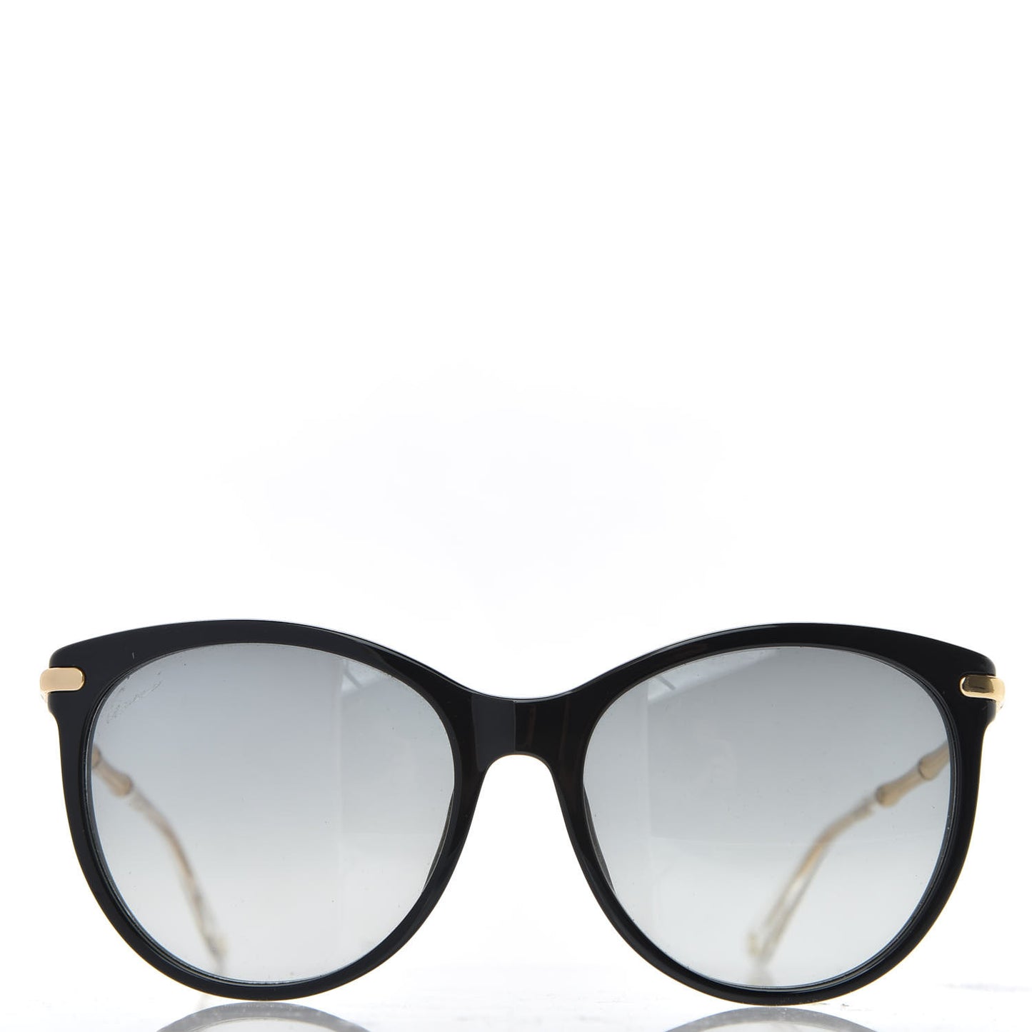 This is an authentic pair of GUCCI Crystal Bamboo Cat Eye GG3771 Sunglasses in Black and Gold. These stylish sunglasses are retro-style black frames and have gold-tone bamboo bar arms and a GG logo at the tips.