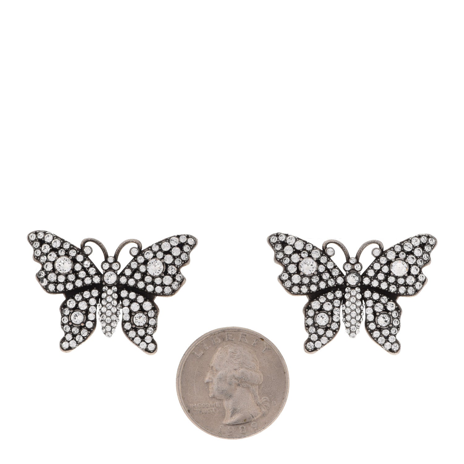 This is an authentic pair of GUCCI Crystal Butterfly Stud Earrings. These simply chic earrings are two butterflies in aged palladium finish and are covered in crystals.
