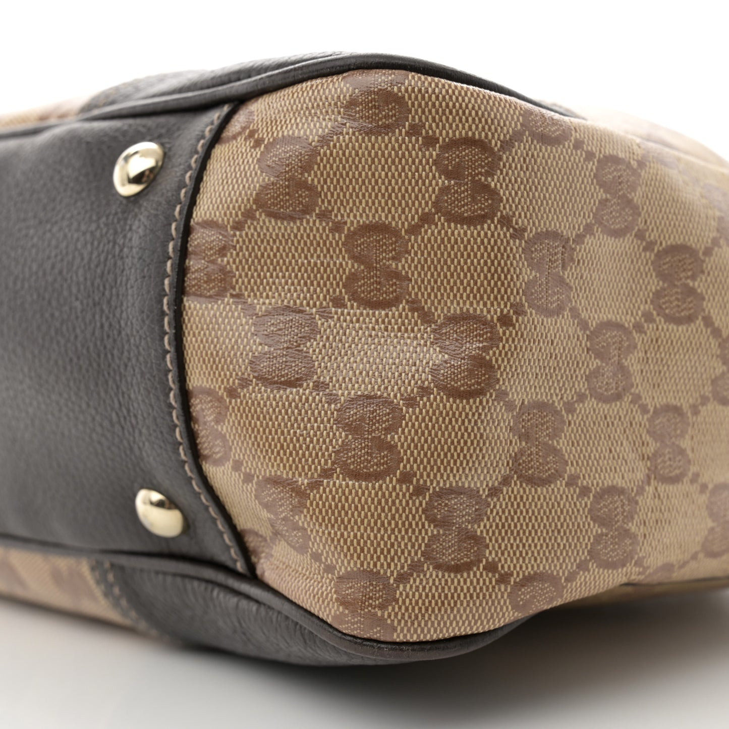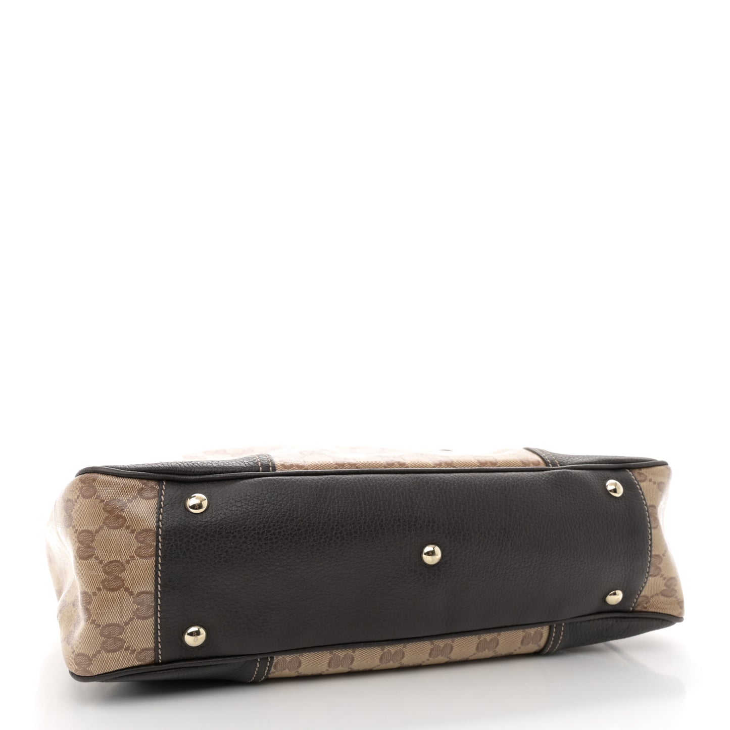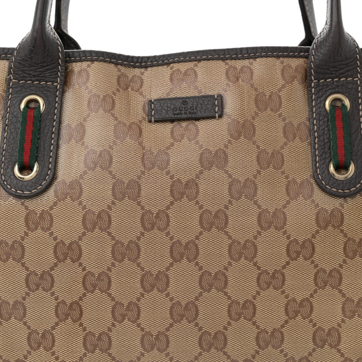This is an authentic GUCCI Crystal Monogram Medium Princy Tote in Dark Brown. The tote is crafted of sturdy brown on beige Gucci GG monogram coated canvas. The bag features dark brown cowhide leather top handles and top crest trim as well as at the base corners with green and red ribbon embellishments. The top zipper opens to a brown fabric interior with zipper and patch pockets.Follow this item for alerts. Gucci is a registered trademark of Gucci. FASHIONPHILE is not affiliated with Gucci.
