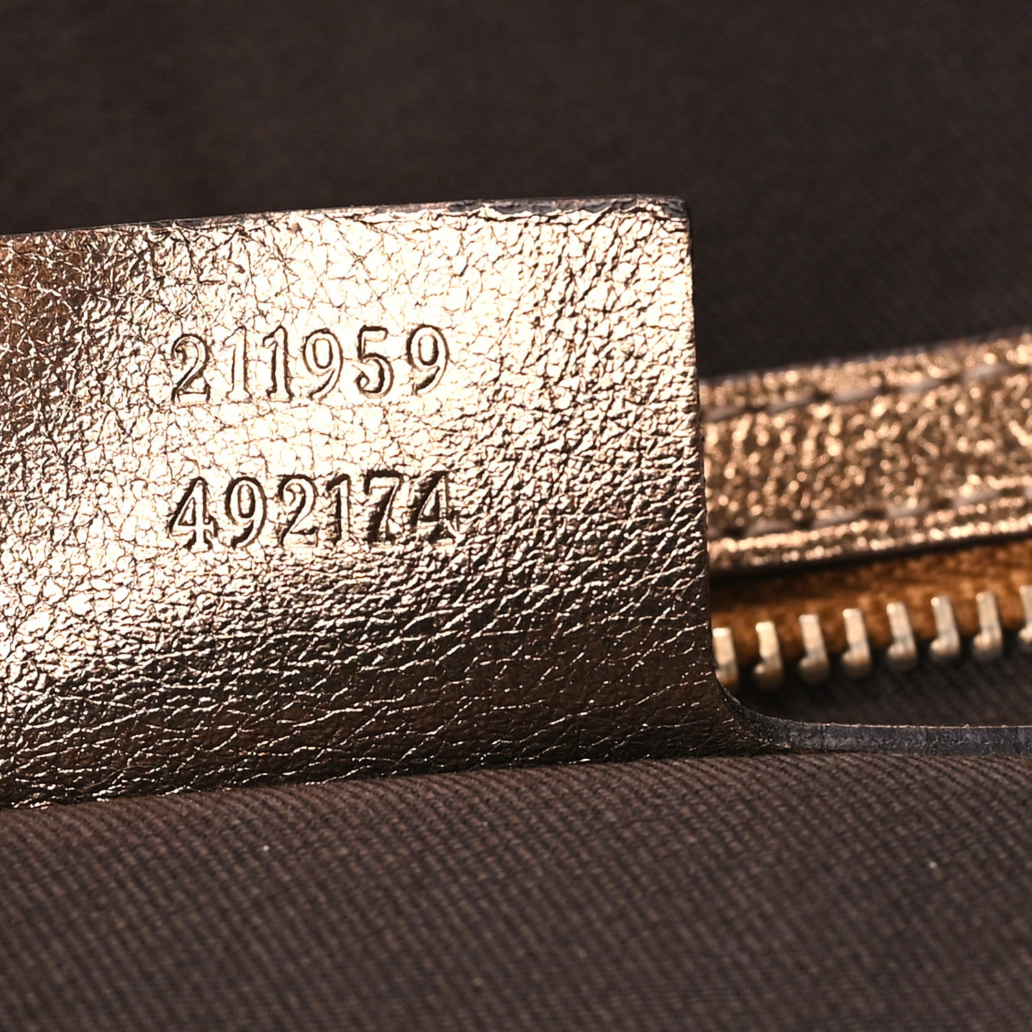 This is an authentic GUCCI Crystal Monogram Studded Medium Irina Tote. This stunning tote is beautifully crafted of coated Gucci GG monogram coated canvas. It features bronze metallic leather studded strap top handles and a bronze leather top crest. The top of the bag is open to a mocha fabric interior with a zipper pocket.Follow this item for alerts. Gucci is a registered trademark of Gucci. FASHIONPHILE is not affiliated with Gucci.