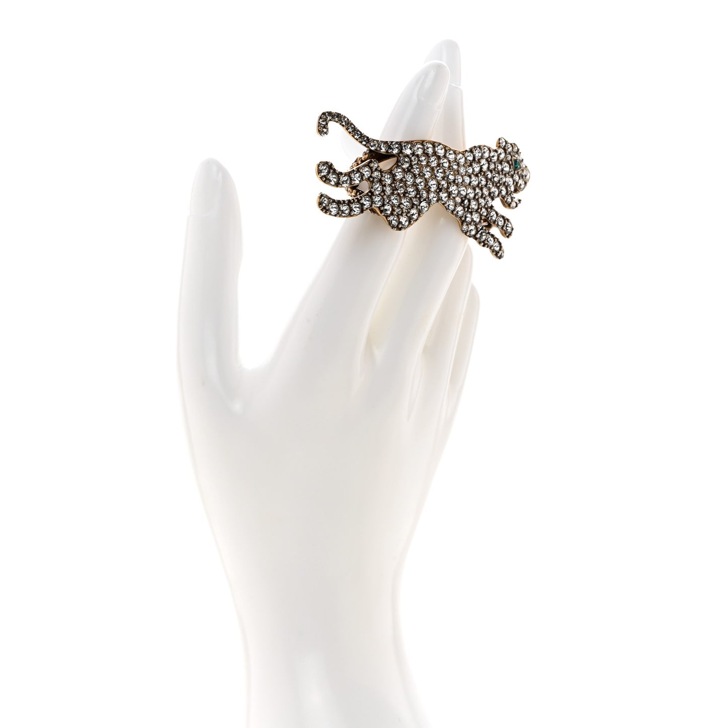 This is an authentic pair of GUCCI Crystal Tiger Multi-Finger Ring size M in Aged Gold and Emerald. This trendy chic ring is crafted in an aged gold-tone with a tiger emblem adorned with colorful crystals.Follow this item for alerts. Gucci is a registered trademark of Gucci. FASHIONPHILE is not affiliated with Gucci.
