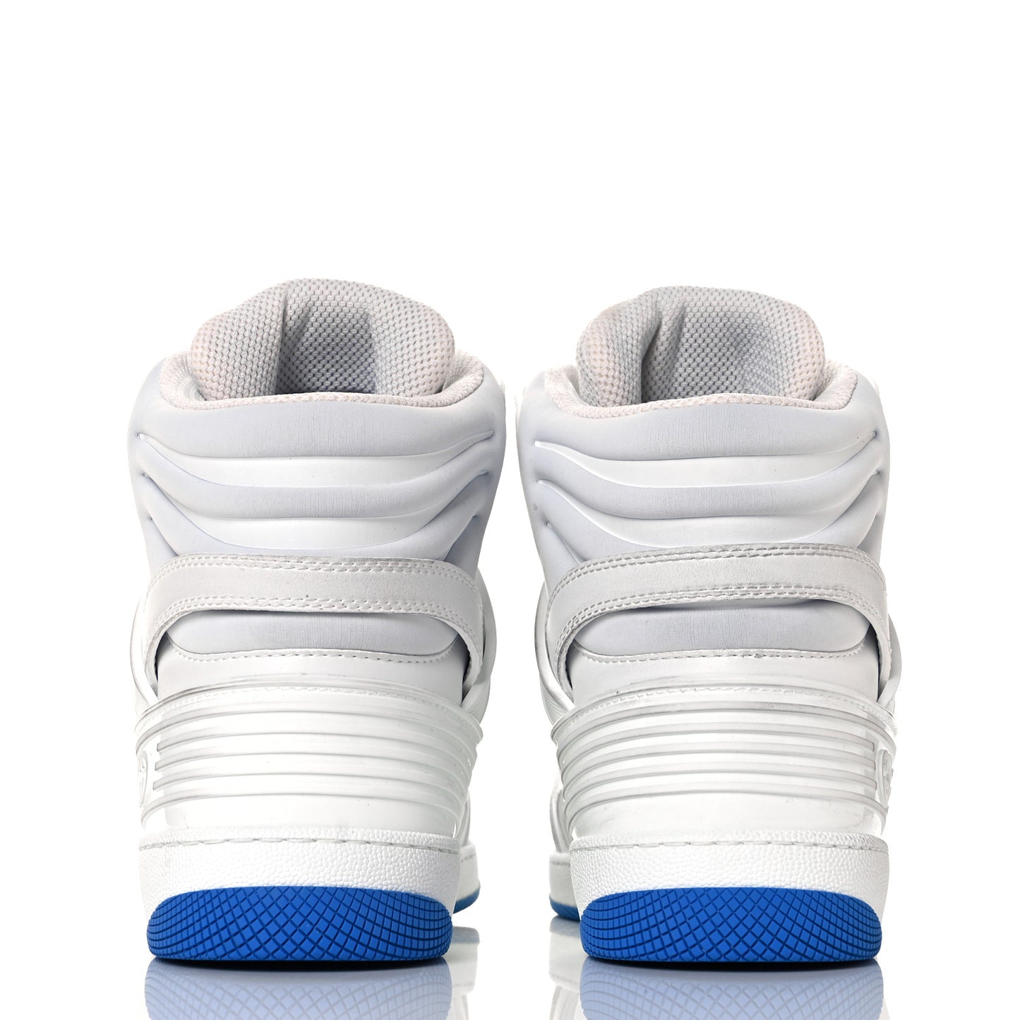 This is an authentic pair of GUCCI Demetra Mens Basket High Top Sneakers 9.5 in Great White. These stylish sneakers are crafted of white and grey faux leather with a blue sole.Follow this item for alerts. Gucci is a registered trademark of Gucci. FASHIONPHILE is not affiliated with Gucci.