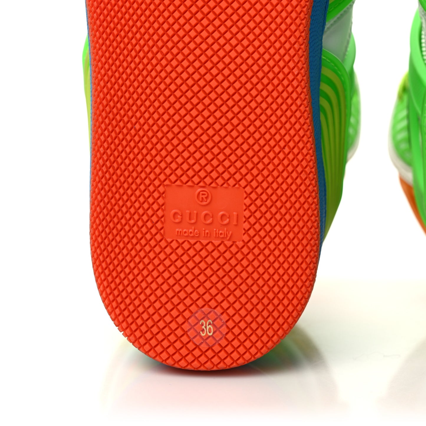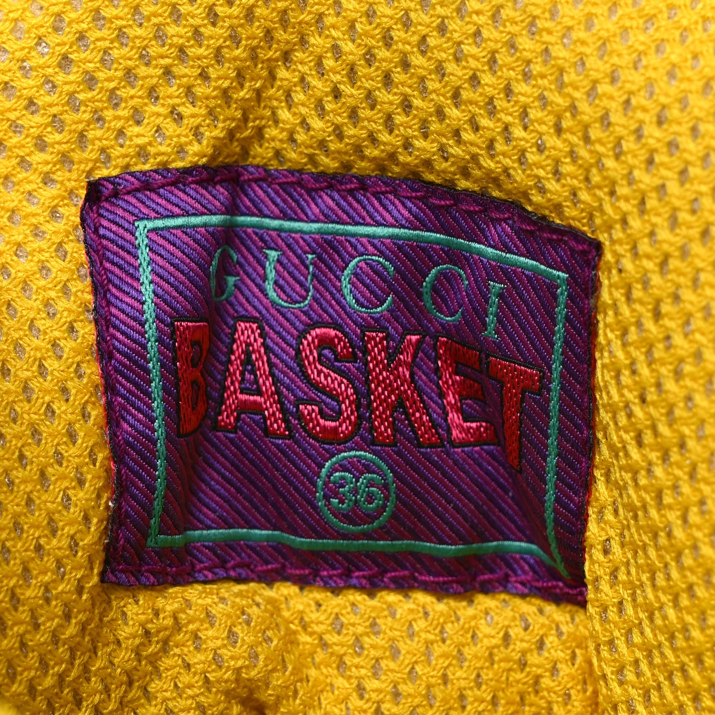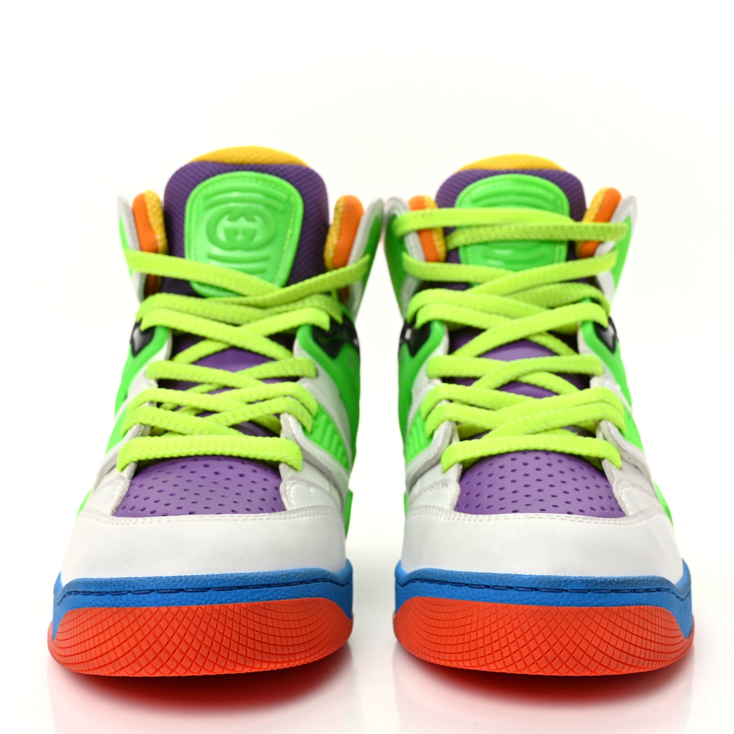 This is an authentic pair of GUCCI Demetra Womens Basket High Top Sneakers size 36 in Great White and Shine Purple. These vibrant shoes are crafted of multicolor fabric made of 70% vegetable raw materials, with rubber soles.Follow this item for alerts. Gucci is a registered trademark of Gucci. FASHIONPHILE is not affiliated with Gucci.
