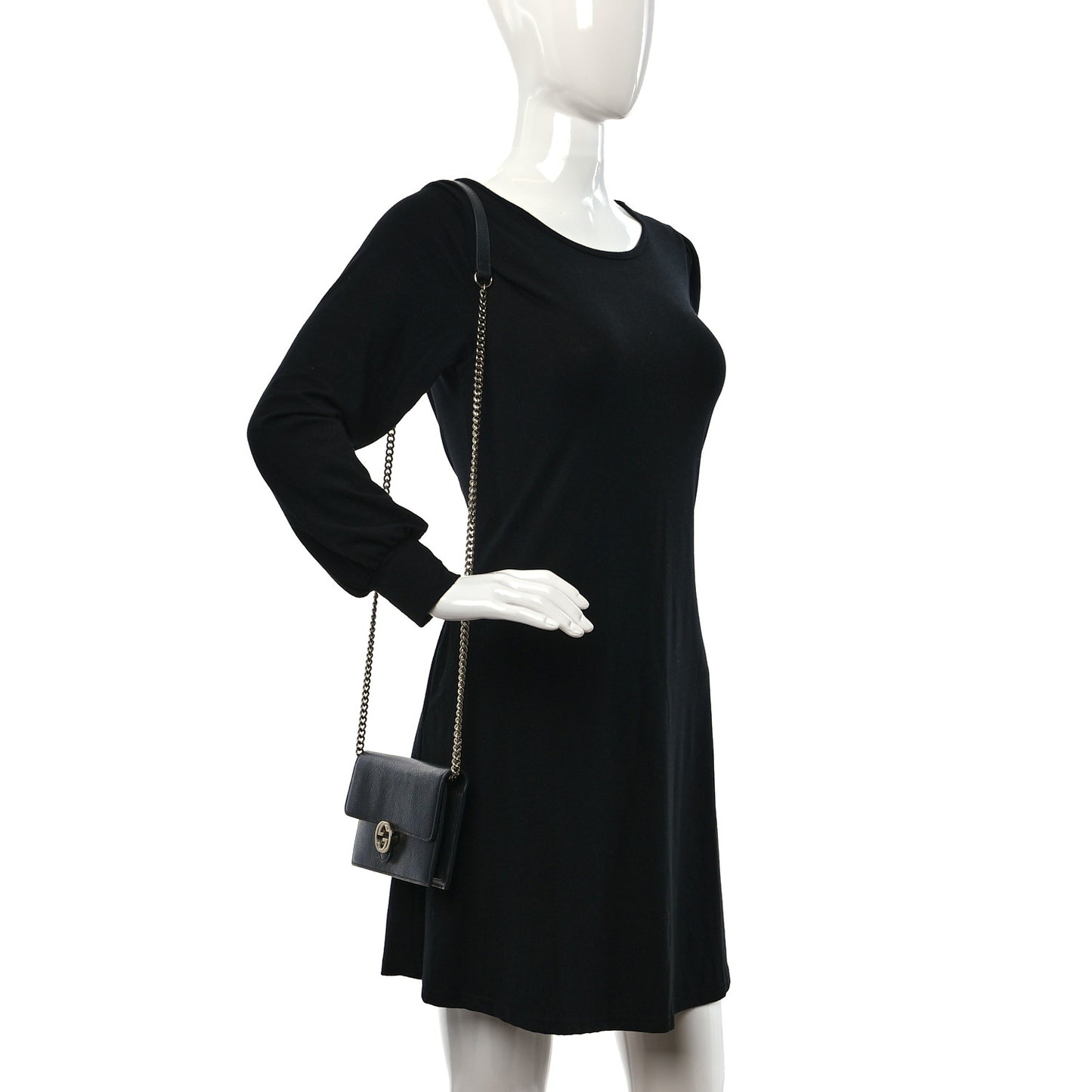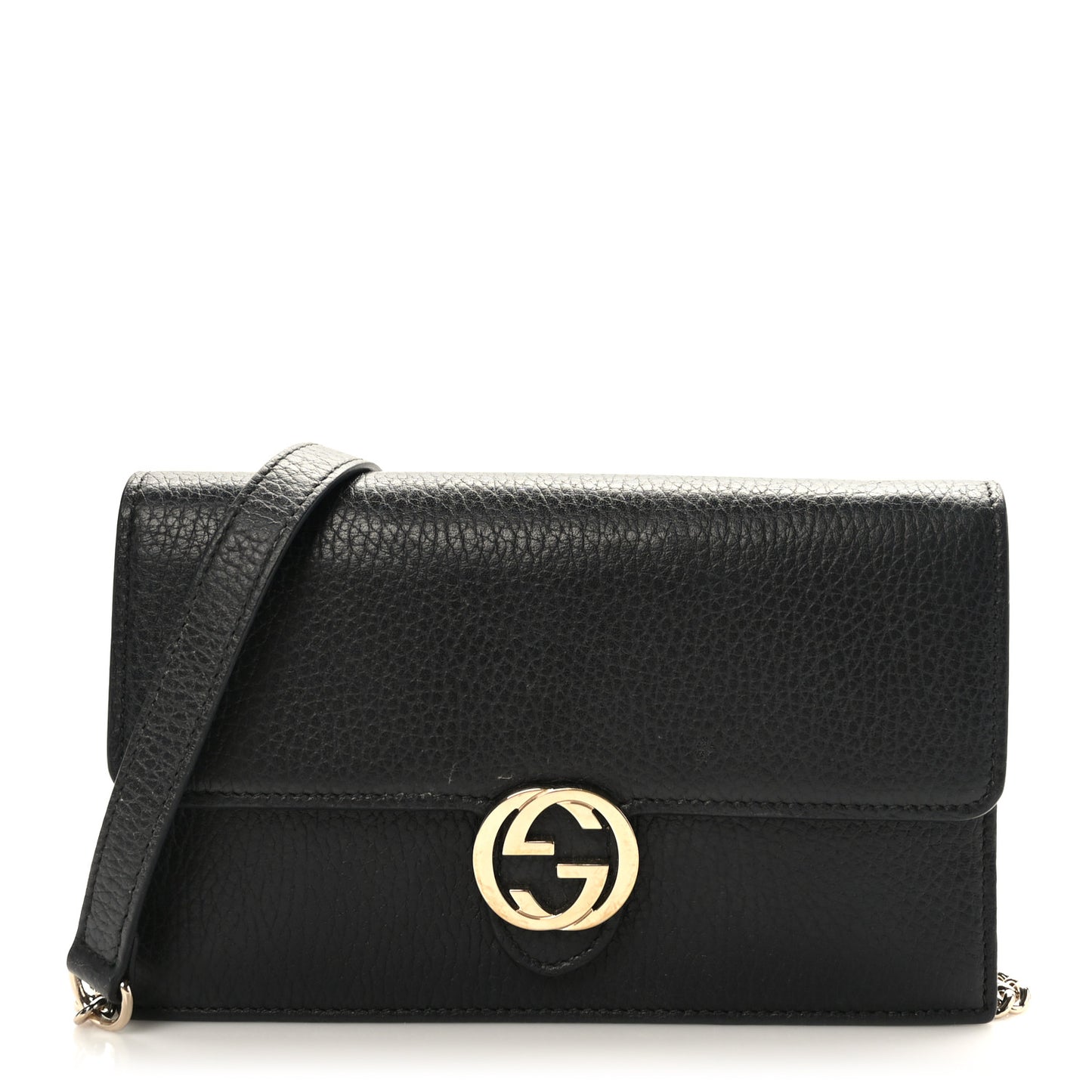 This is an authentic GUCCI Dollar Calfskin Interlocking G Chain Wallet in Black. This stylish clutch wallet is crafted of textured calfskin leather in black and features a front flap with a polished light gold interlocking G Gucci logo and an optional crossbody gold chain shoulder strap with a leather shoulder pad. The flap opens to a compact black leather and fabric interior with card slots and a zipper compartment.Follow this item for alerts. Gucci is a registered trademark of Gucci. FASHIONPHILE is not affiliated with Gucci.