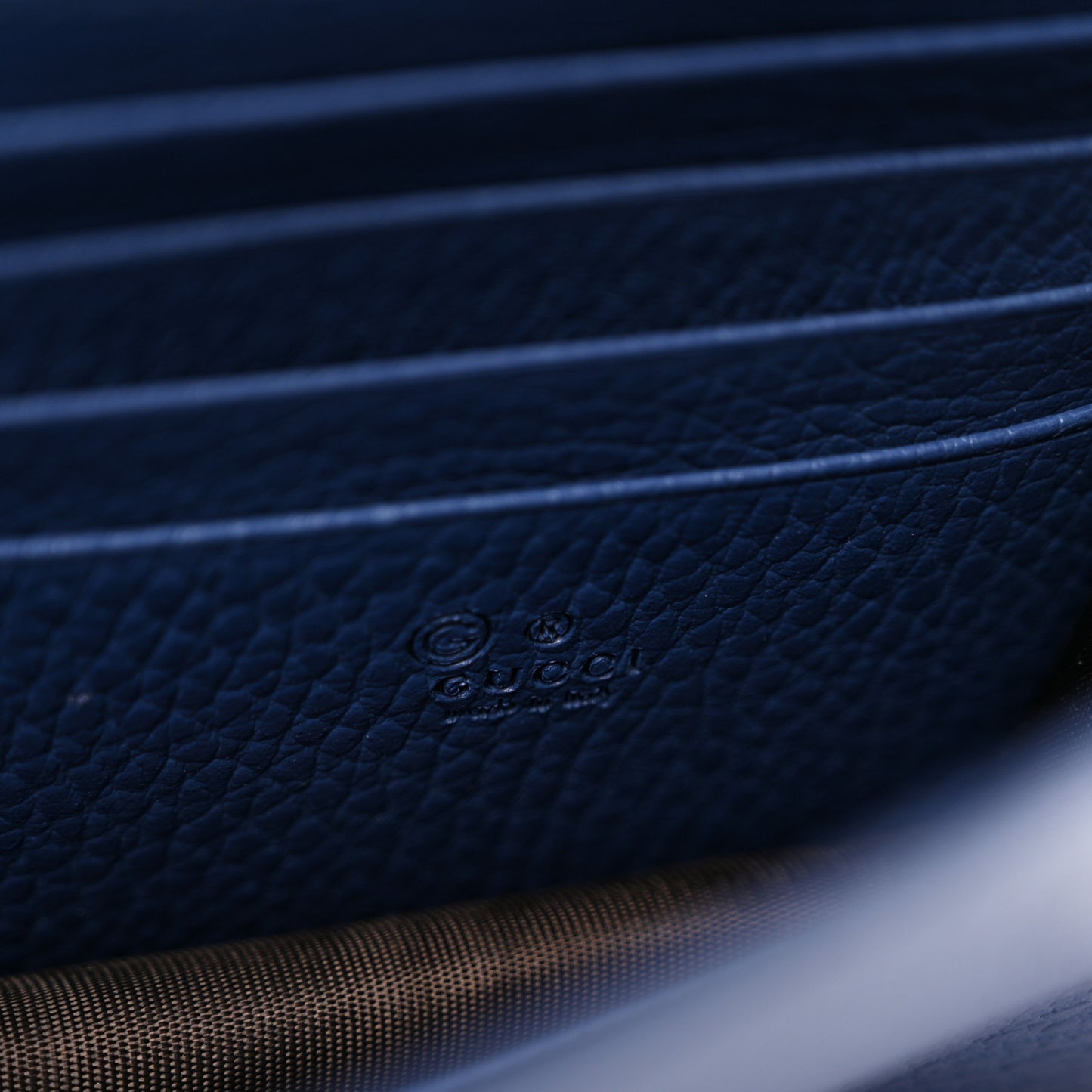 This is an authentic GUCCI Dollar Calfskin Interlocking G Chain Wallet in Caspian. This clutch wallet is crafted of textured calfskin leather in blue and features a front flap with a polished light gold interlocking GG Gucci logo and an optional crossbody strap. The front flap opens to a matching blue leather and black fabric interior with a zippered compartment, card slots, and patch pockets.Follow this item for alerts. Gucci is a registered trademark of Gucci. FASHIONPHILE is not affiliated with Gucci.