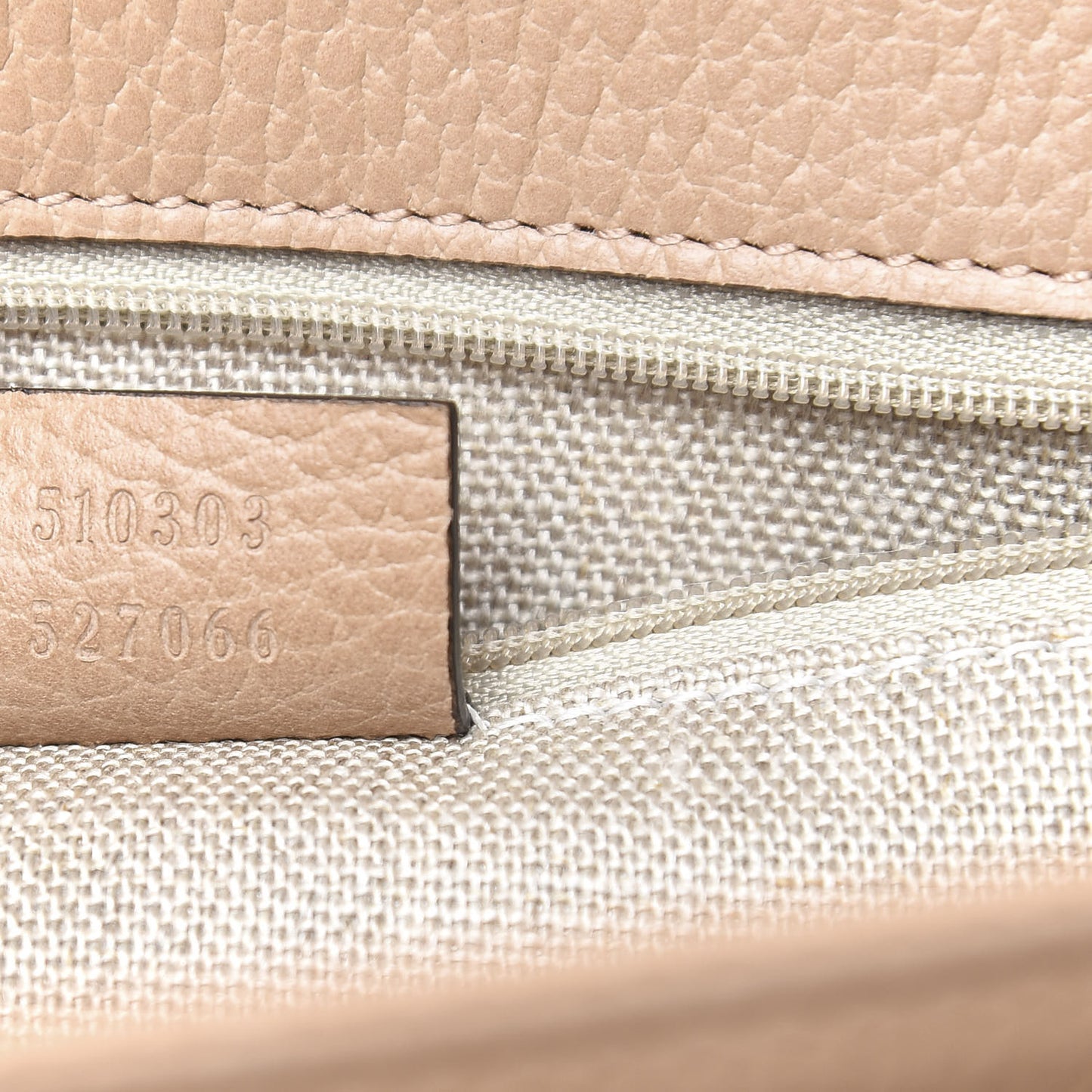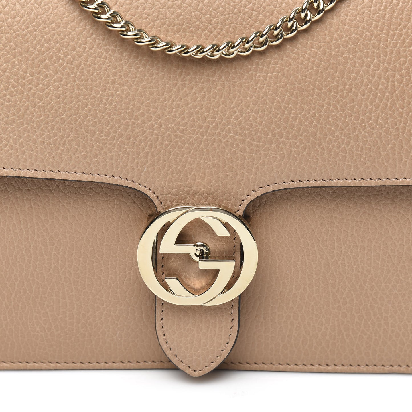 This is an authentic GUCCI Dollar Calfskin Interlocking G Shoulder Bag in Camelia. This chic shoulder bag is crafted of grained calfskin leather in pink-beige. The bag has a waist-length shoulder strap in gold and a facing flap with a polished light gold interlocking GG emblem lock closure. The flap opens to a partitioned taupe fabric interior with pockets. This glamorous handbag radiates stylish sophistication from Gucci!