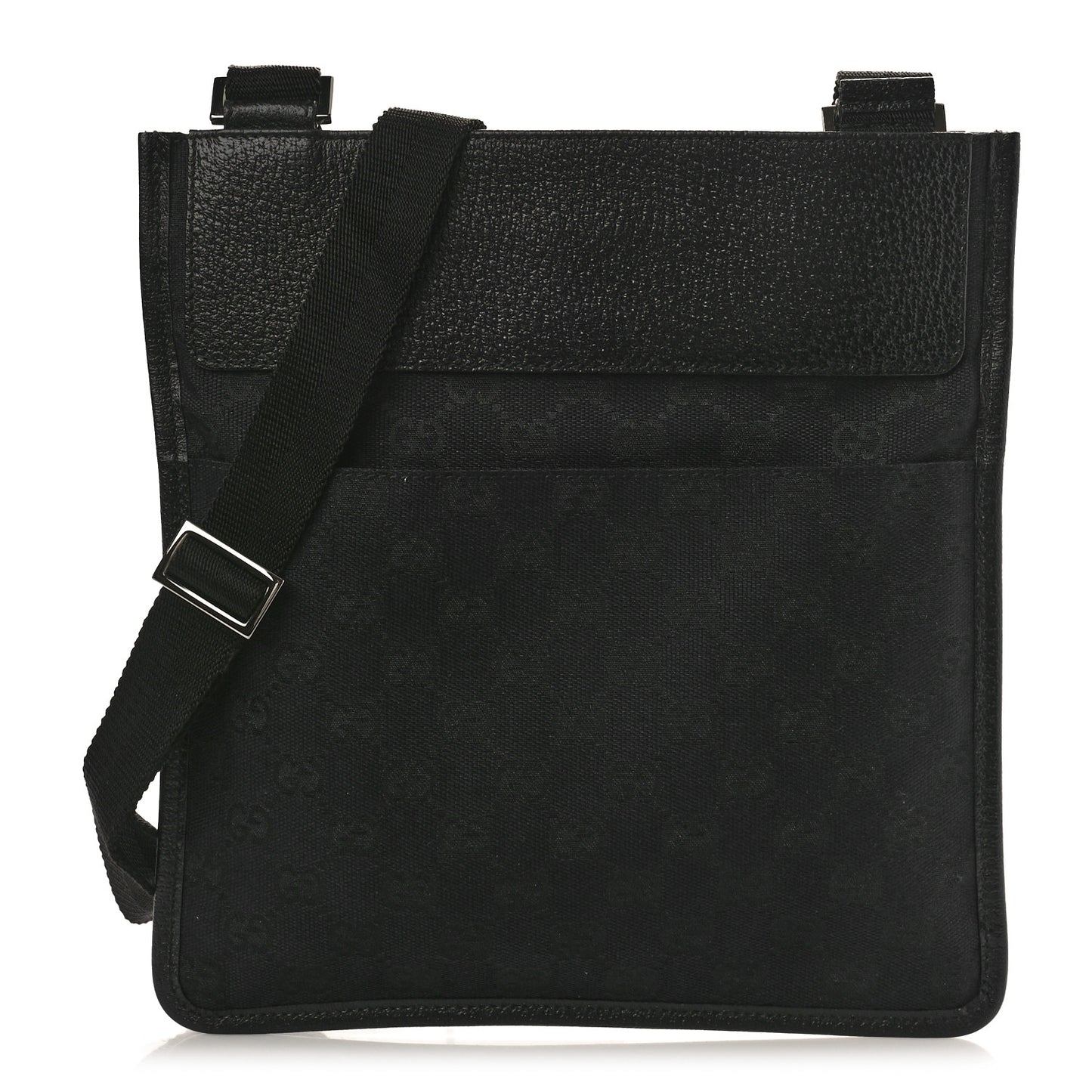 This is an authentic GUCCI GG Monogram Messenger Crossbody Bag in Black. This chic messenger bag is crafted of black Gucci GG monogram canvas. The bag features a black nylon adjustable body strap with silver hardware and a frontal patch pocket on the exterior. The top opens to a black fabric interior with zippered pocket. This bag has room for everyday utility and the sophisticated style of Gucci!Follow this item for alerts. Gucci is a registered trademark of Gucci. FASHIONPHILE is not affiliated with Gucci.