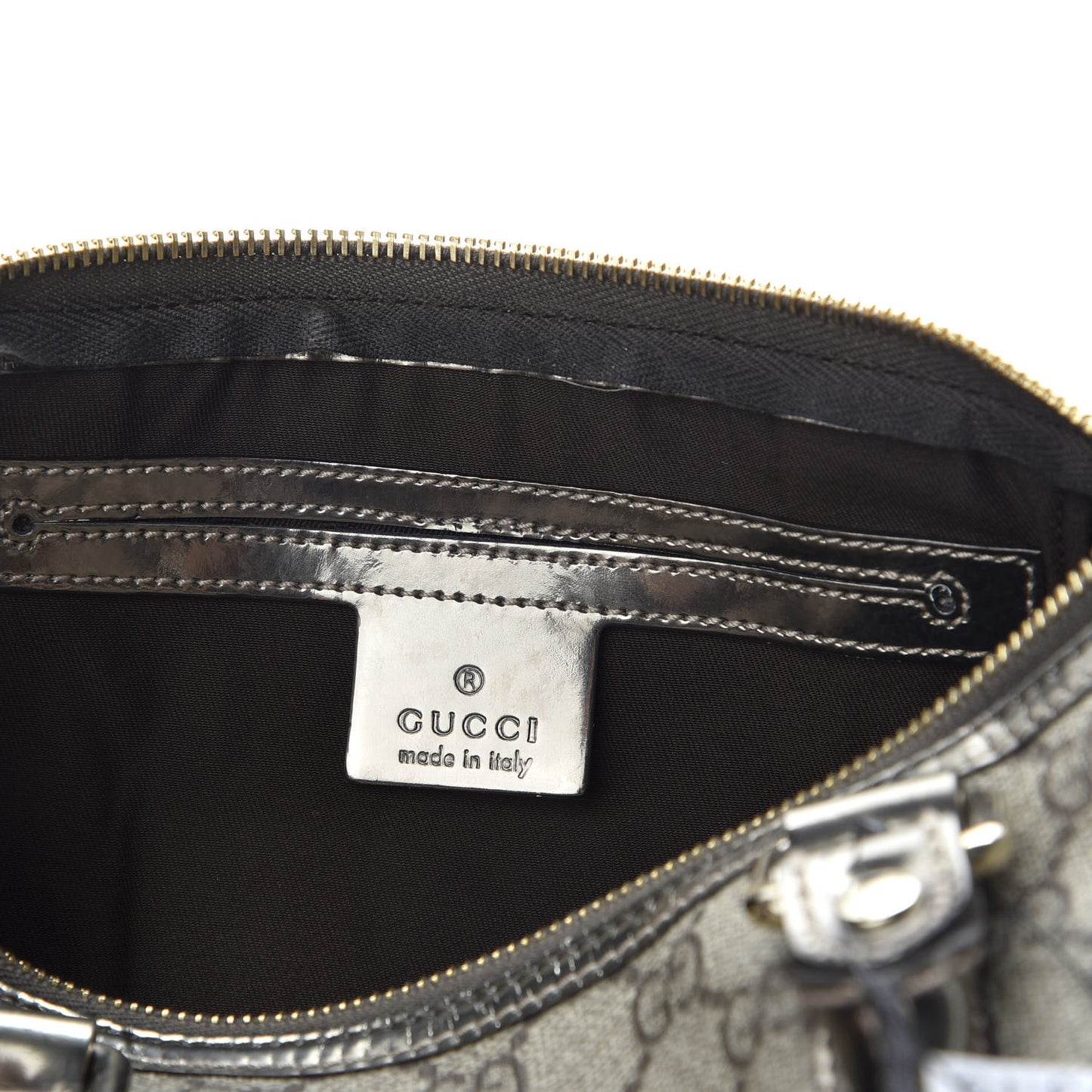 This is an authentic GUCCI GG Plus Monogram Small Joy Boston in Metallic. This chic Boston style tote is finely crafted of beige Gucci GG monogram canvas. The handbag features metallic gold leather trim, piping, and rolled top handles; all detailed with polished gold hardware. The top zipper opens to a brown fabric interior with pockets.Follow this item for alerts. Gucci is a registered trademark of Gucci. FASHIONPHILE is not affiliated with Gucci.