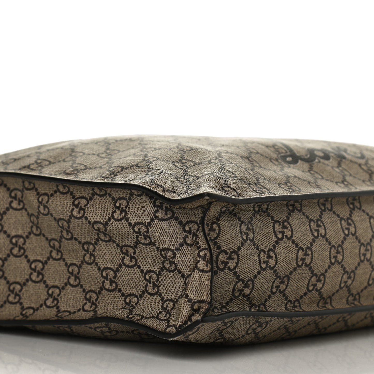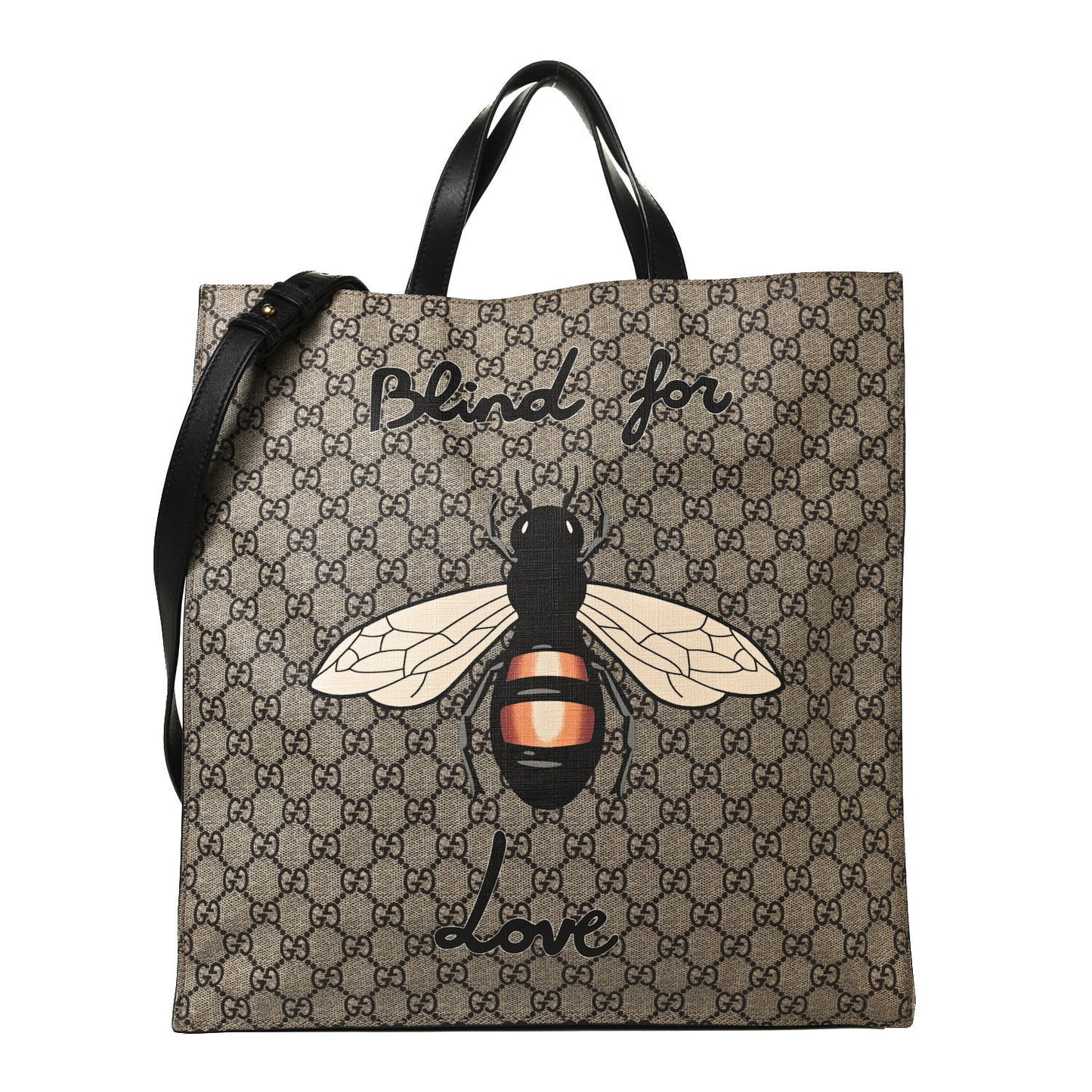 This is an authentic GUCCI GG Supreme Monogram Bee Tote. This chic tote bag is crafted of brown Gucci GG monogram coated canvas with a colorful print overlay of a bee with signature black embroidered lettering that says "BLIND FOR LOVE". The handbag features black leather top handles and an optional black leather shoulder strap with aged gold hardware. The top is open to a natural canvas interior with the number "25" in red and two zipper pockets.