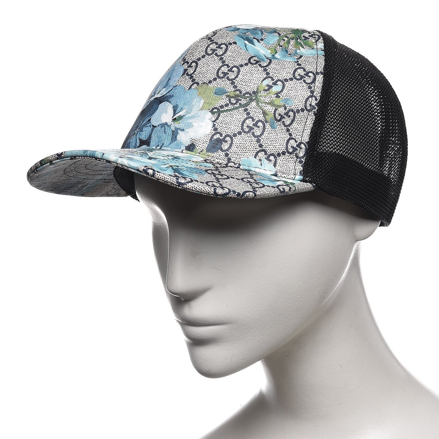 This is an authentic GUCCI GG Supreme Monogram Blooms Print Baseball Hat XL in Blue. This sporty yet stylish cap is crafted of Gucci GG monogram canvas with a floral blue print and black mesh. This medium cap features a 2.5 inch rim extending from the cap itself, that is 8 inches in width with a snap band to fit perfectly. This is an excellent cap for everyday use from Gucci!Follow this item for alerts. Gucci is a registered trademark of Gucci. FASHIONPHILE is not affiliated with Gucci.
