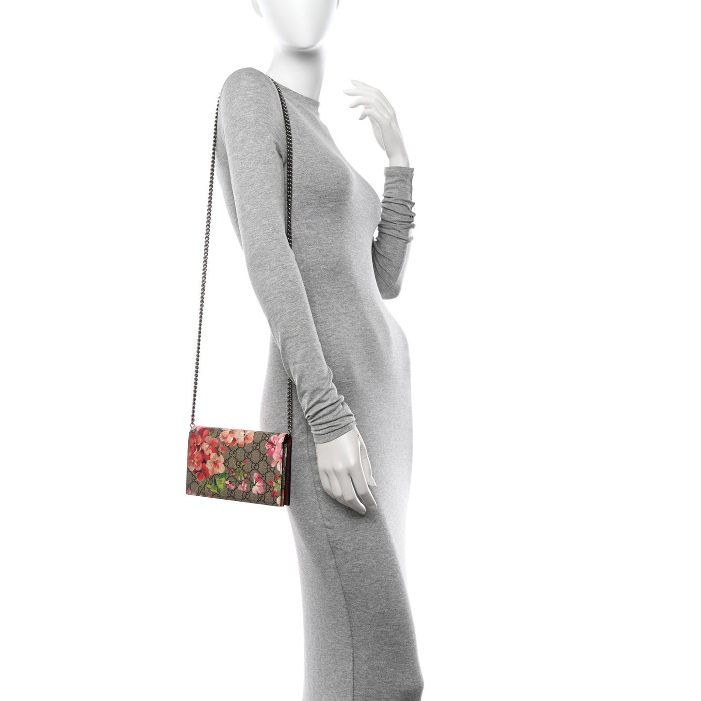 This is an authentic GUCCI GG Supreme Monogram Blooms Chain Wallet in Beige, Multicolor, and Dry Rose. This chain wallet is crafted of GG monogram-coated canvas, with a pink floral pattern overlay. The bag features an optional aged silver chain shoulder strap and opens to a matte burgundy leather interior with a zipper compartment and card slot panels.Follow this item for alerts. Gucci is a registered trademark of Gucci. FASHIONPHILE is not affiliated with Gucci.