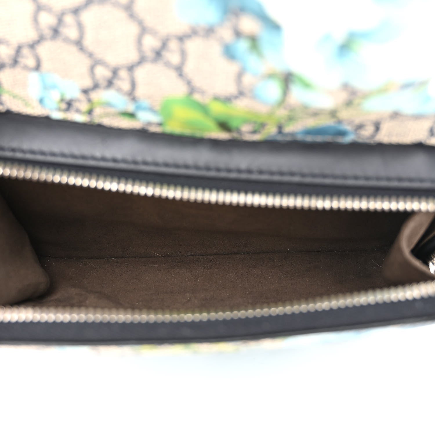 This is an authentic GUCCI GG Supreme Monogram Blooms Small Day Backpack in Blue. This stylish backpack is crafted of Gucci GG monogram coated canvas with a blue floral print. The bag features an external zipper pocket, nylon shoulder straps, silver hardware, and dark blue leather trim. The top zipper opens to a spacious taupe microfiber interior with zipper and patch pockets.Follow this item for alerts. Gucci is a registered trademark of Gucci. FASHIONPHILE is not affiliated with Gucci.
