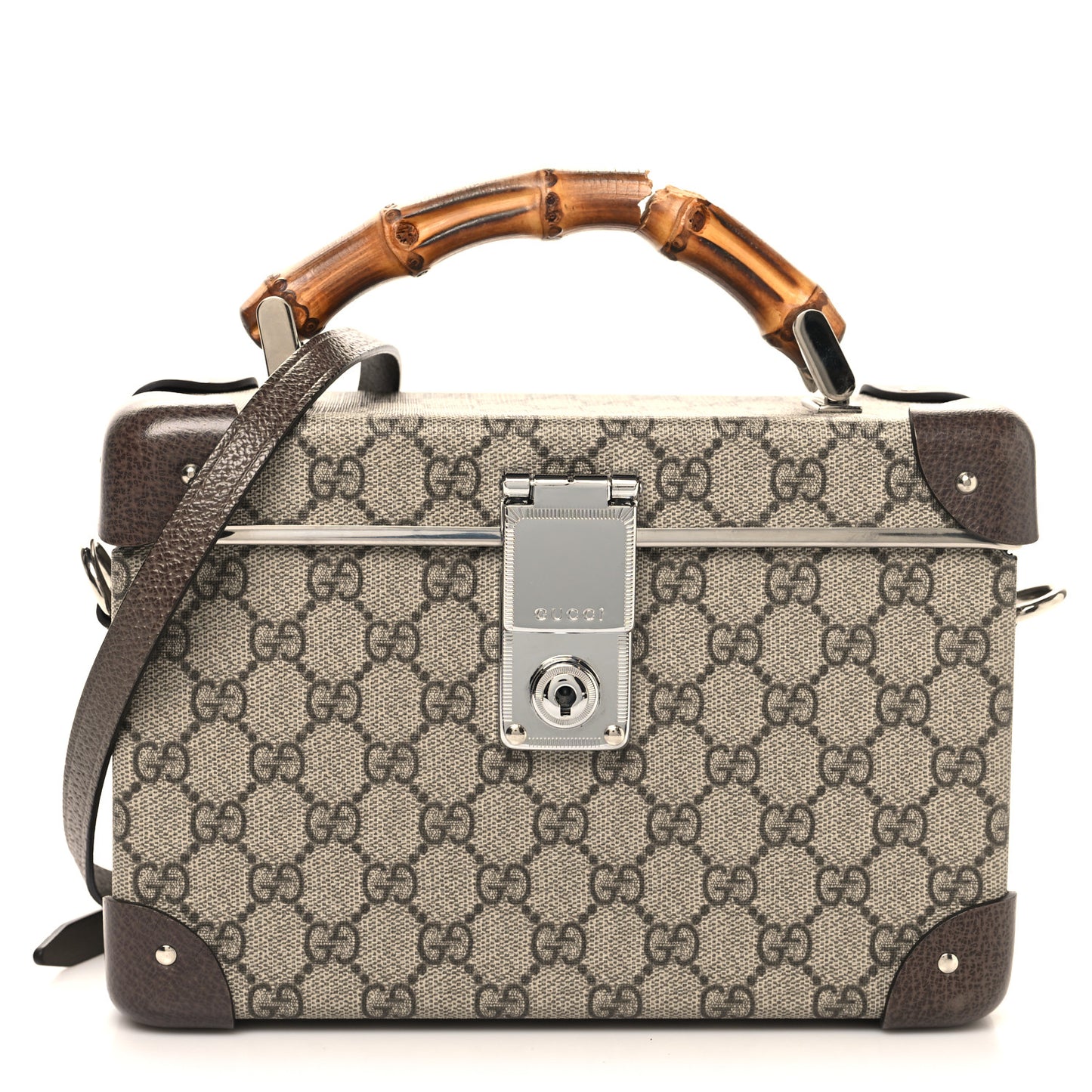 This is an authentic GUCCI GG Supreme Monogram Globe-Trotter Beauty Case in Brown. This stylish case is crafted of GG monogram coated canvas with brown leather trim. This case features a silver lock closure and a bamboo top handle, and an optional removable leather strap. The top opens to a red fabric interior.Follow this item for alerts. Gucci is a registered trademark of Gucci. FASHIONPHILE is not affiliated with Gucci.