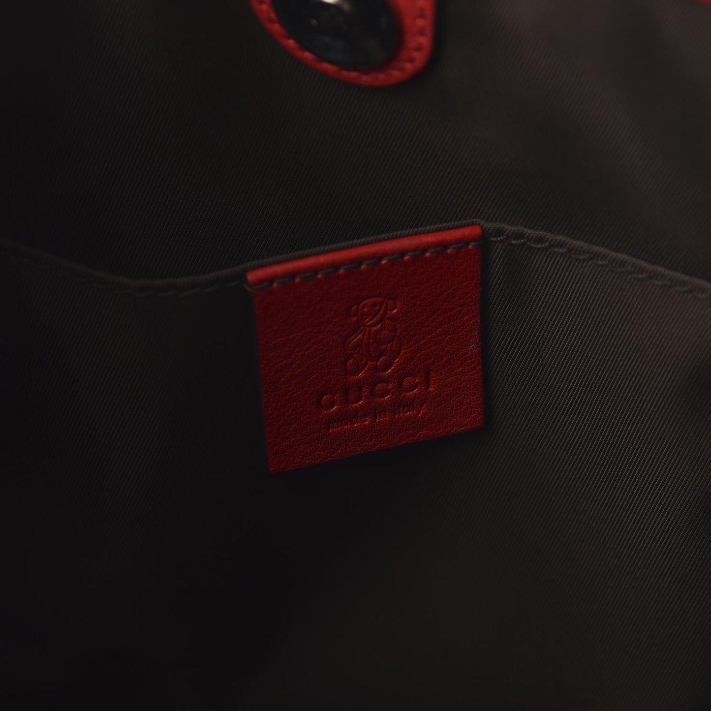 This is an authentic GUCCI GG Supreme Monogram Kid's Doll Print Tote. This stylish tote is crafted of Gucci GG monogram coated canvas. The bag features red leather top handles and trim. The top is open to a brown nylon interior with a patch pocket.Follow this item for alerts. Gucci is a registered trademark of Gucci. FASHIONPHILE is not affiliated with Gucci.