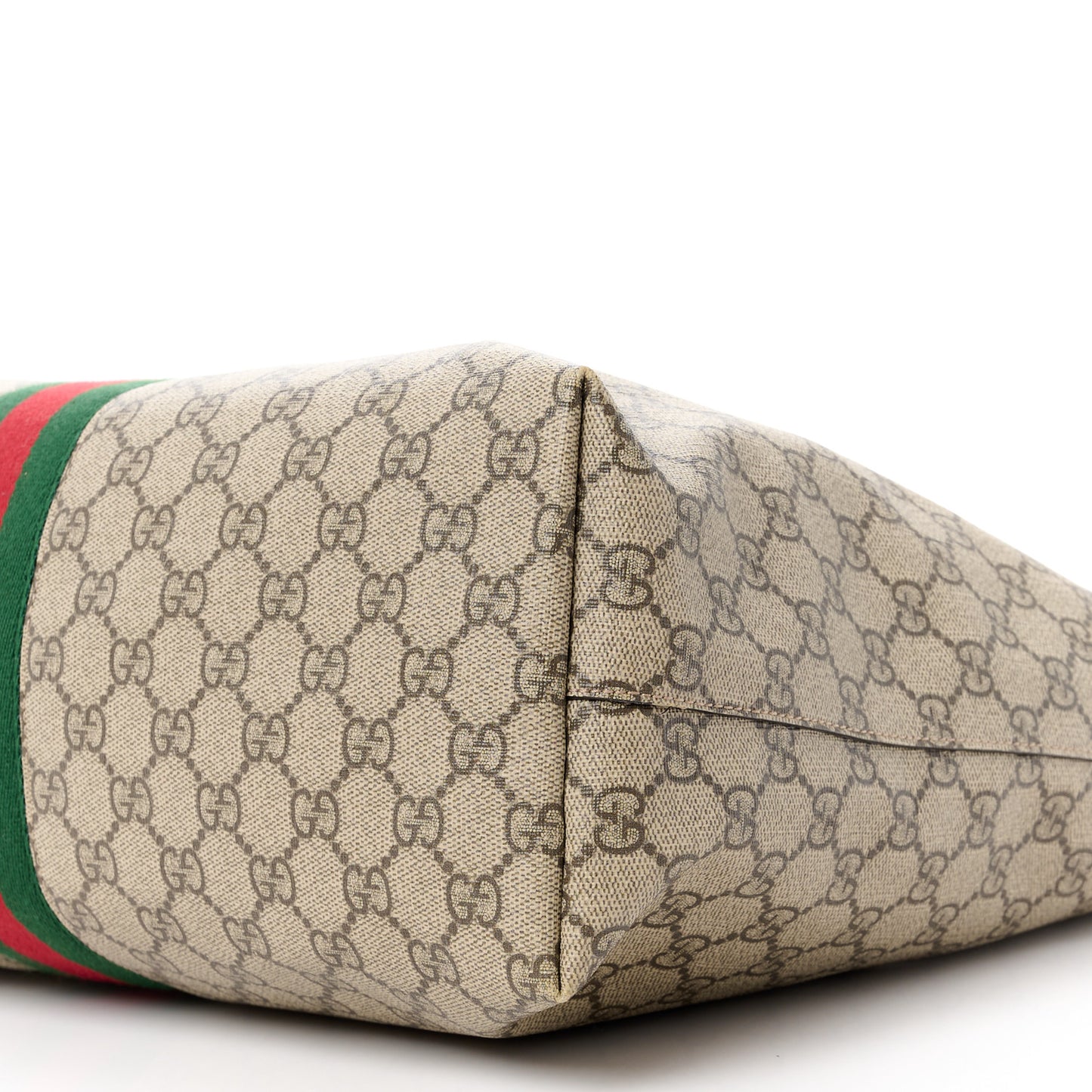 This is an authentic GUCCI GG Supreme Monogram Medium Ophidia Shopping Tote in Brown. This chic tote is crafted of Gucci GG supreme monogram coated canvas with a green and red web stripe detail. The handbag features brown leather strap handles. The top is open to a microfiber interior with zipper and patch pockets.