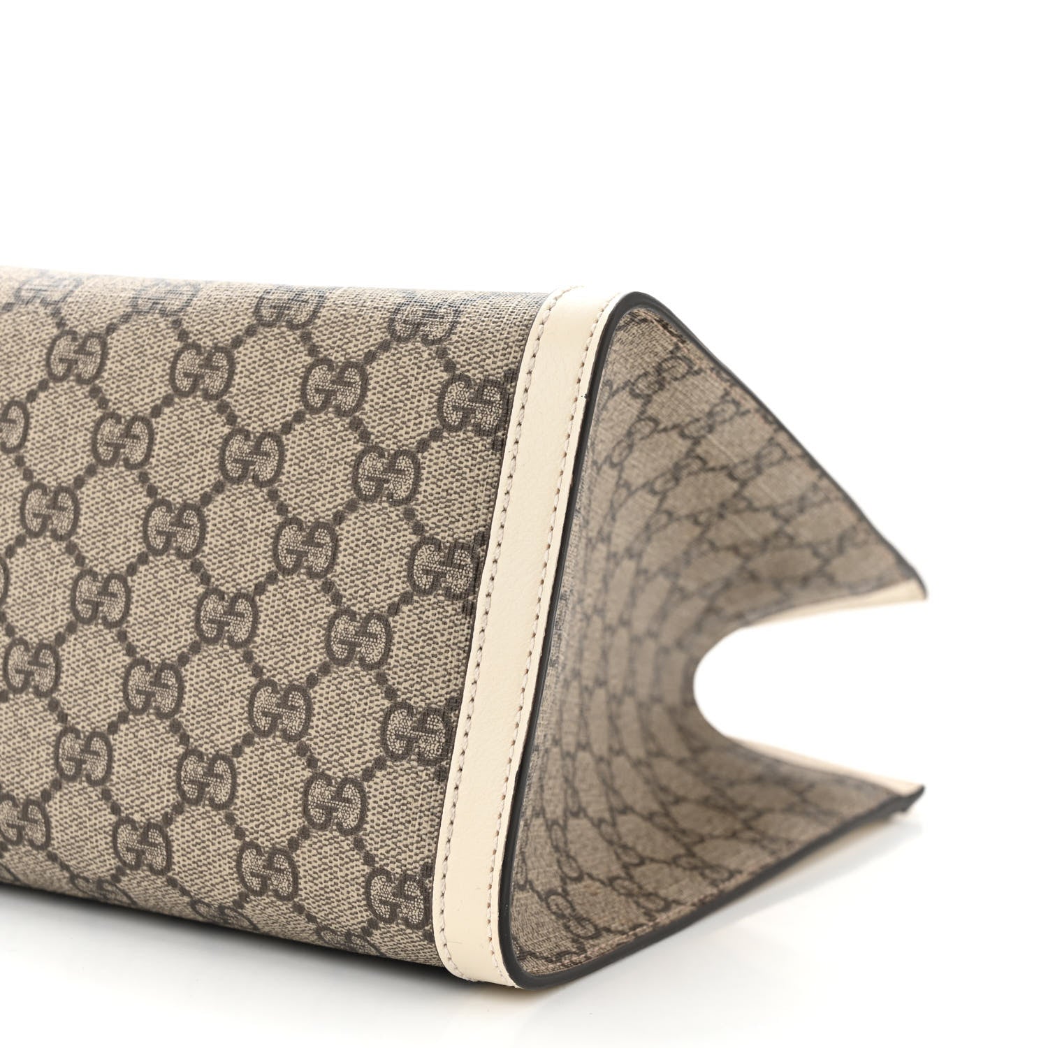 This is an authentic GUCCI GG Supreme Monogram Medium Padlock Tote in White. This stylish tote is crafted of GG Supreme Monogram canvas with white leather trim. The bag features gold chain-strap handles with white leather shoulder pads and a white leather crossover strap with gold s-lock. This opens to a beige microfiber interior with zipper and patch pockets.Follow this item for alerts. Gucci is a registered trademark of Gucci. FASHIONPHILE is not affiliated with Gucci.