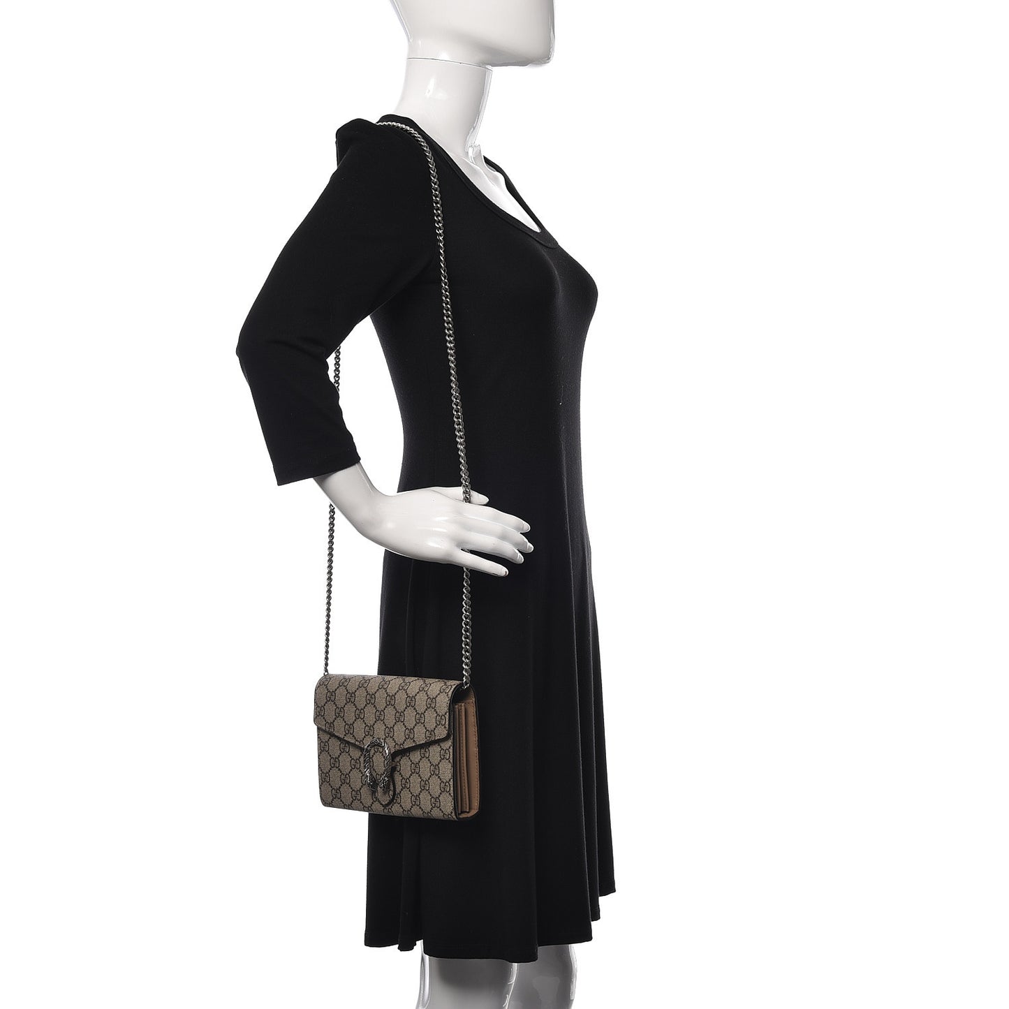 This is an authentic GUCCI GG Supreme Monogram Dionysus Chain Wallet in Black. This stylish bag is crafted of Gucci GG monogram coated canvas. The bag features an optional aged silver chain-link shoulder strap and a textured horseshoe closure with tiger head spurs on the crossover flap. This opens to a partitioned black fabric and matte black leather interior with card slots, patch pockets, and a zippered compartment.Follow this item for alerts. Gucci is a registered trademark of Gucci. FASHIONPHILE is not affiliated with Gucci.