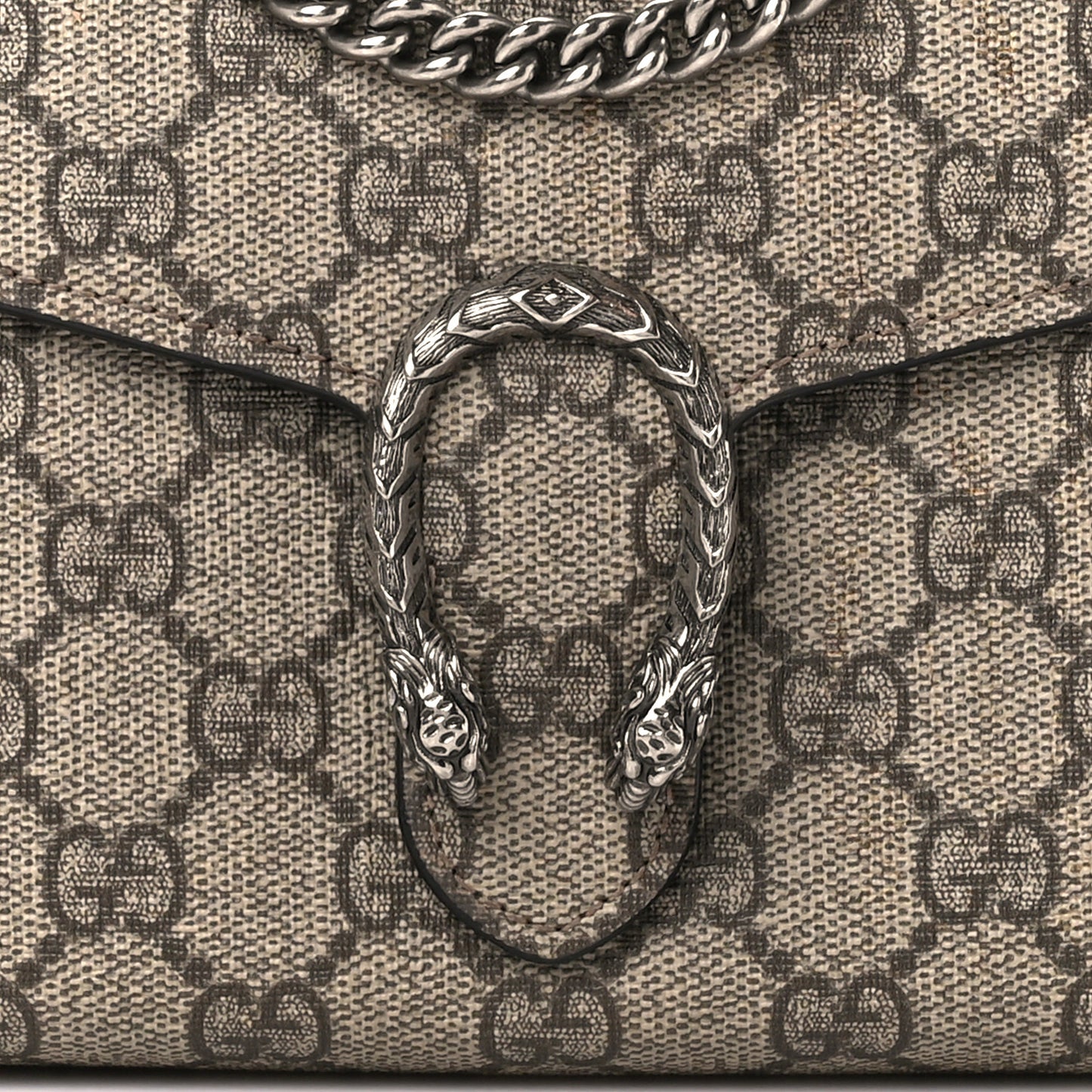 This is an authentic GUCCI GG Supreme Monogram Mini Dionysus Chain Wallet in Beige and Black. This stylish bag is crafted of Gucci GG monogram coated canvas. The bag features an optional aged silver chain-link shoulder strap and a textured horseshoe closure with tiger head spurs on the crossover flap. This opens to a partitioned black fabric and matte black leather interior with card slots, patch pockets, and a zippered compartment.Follow this item for alerts. Gucci is a registered trademark of Gucci. FASHIONPHILE is not affiliated with Gucci.
