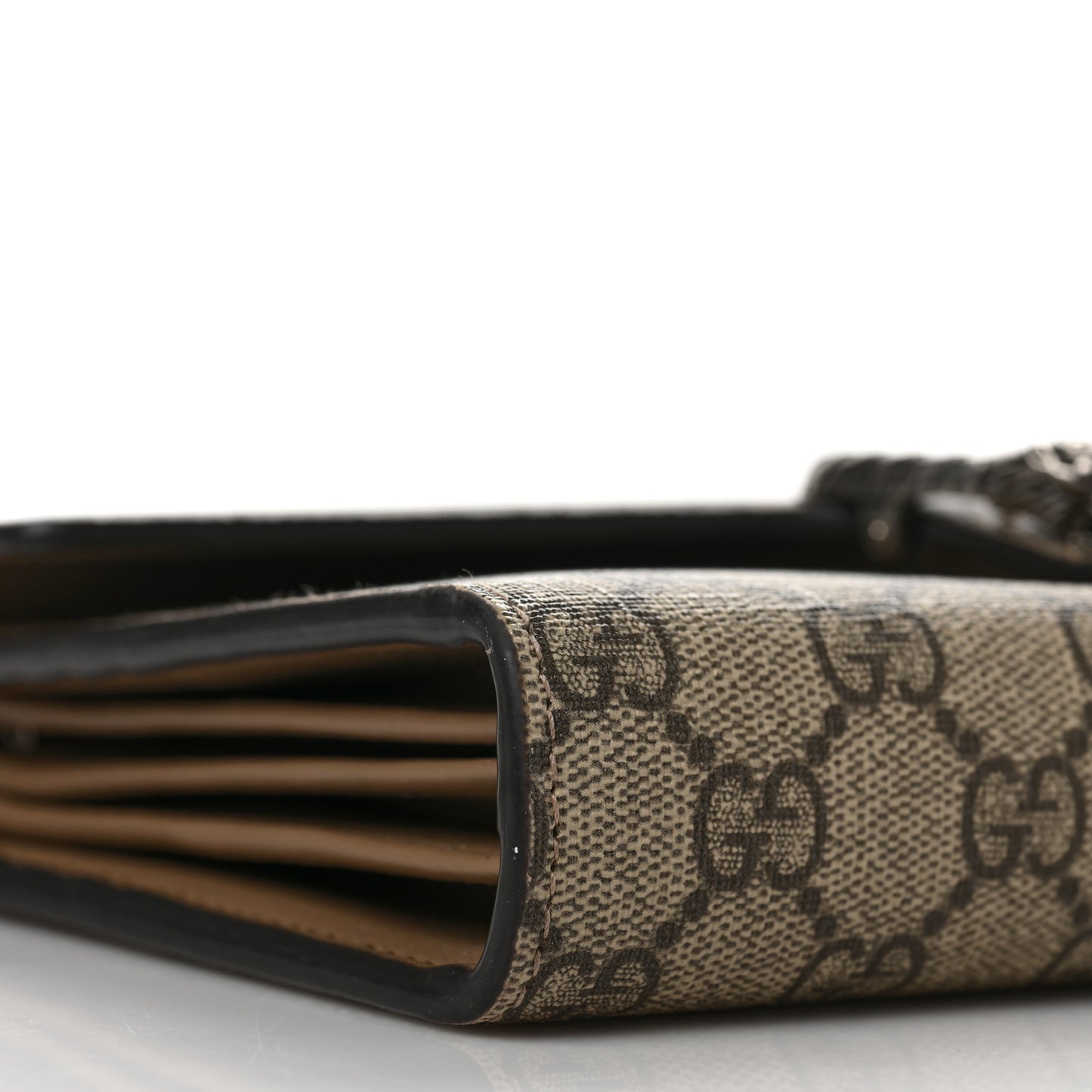 This is an authentic GUCCI GG Supreme Monogram Mini Dionysus Chain Wallet in Beige and Taupe. This stylish versatile bag is crafted of Gucci GG monogram coated canvas. This shoulder bag features an optional aged silver chain-link shoulder strap and a textured horseshoe closure with feline heads at the end. This opens to a taupe leather and brown fabric interior with card slots, pockets, and a zippered central compartment.Follow this item for alerts. Gucci is a registered trademark of Gucci. FASHIONPHILE is not affiliated with Gucci.