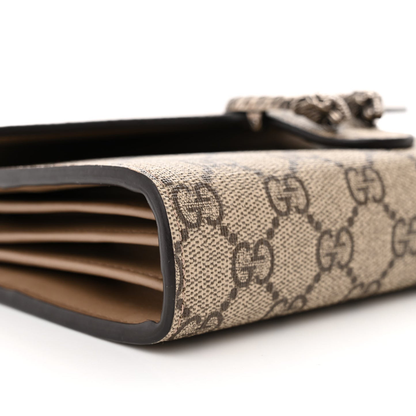 This is an authentic GUCCI GG Supreme Monogram Mini Dionysus Chain Wallet in Beige and Taupe. This wallet is crafted of Gucci GG monogram coated canvas. The bag features a removable aged silver chainlink shoulder strap and a textured horseshoe closure with tiger head spurs. This opens to a partitioned brown fabric and taupe leather interior with card slots, patch pockets, and a zippered compartment.