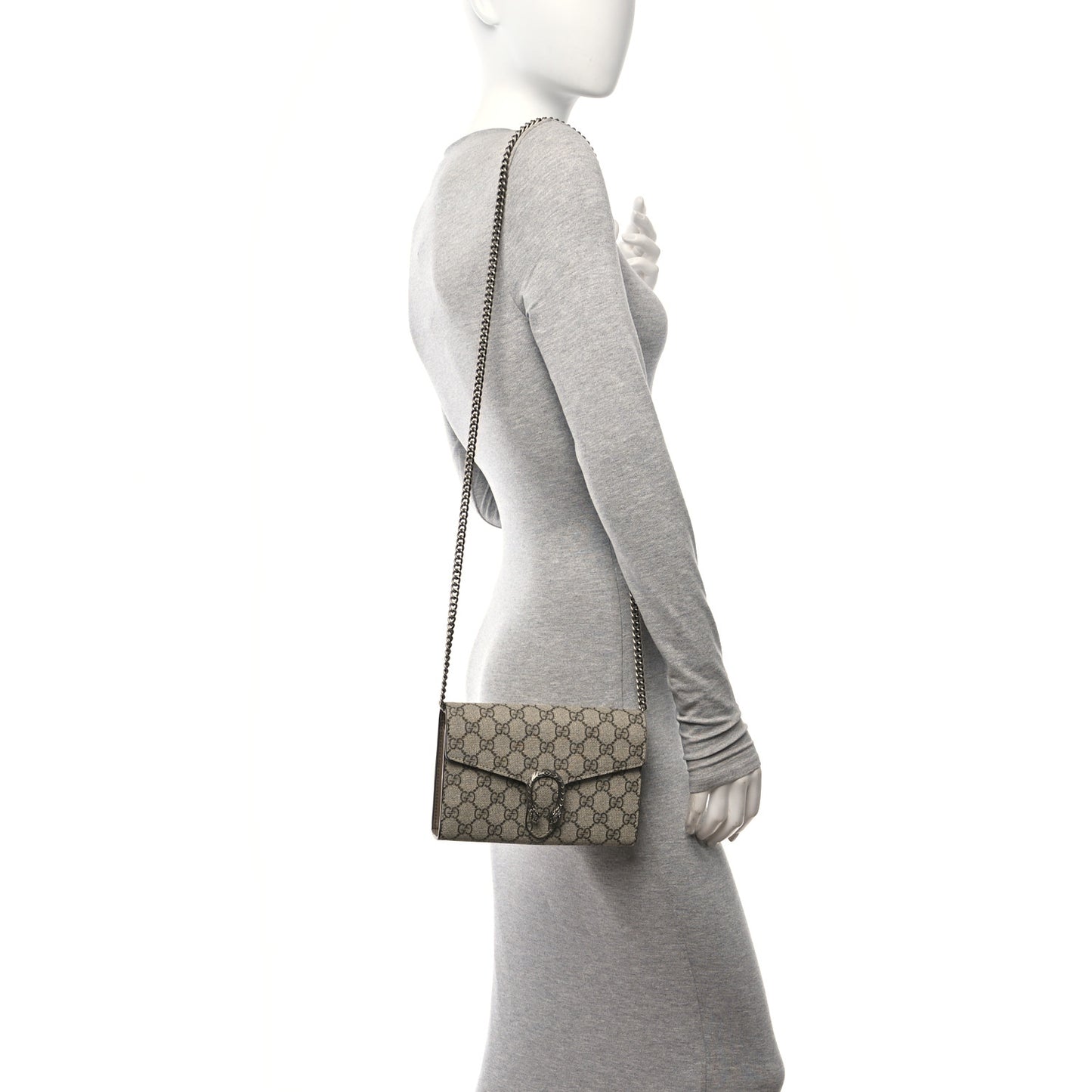 This is an authentic GUCCI GG Supreme Monogram Mini Dionysus Chain Wallet in Beige and Taupe. This wallet is crafted of Gucci GG monogram coated canvas. The bag features a removable aged silver chainlink shoulder strap and a textured horseshoe closure with tiger head spurs. This opens to a partitioned brown fabric and taupe leather interior with card slots, patch pockets, and a zippered compartment.Follow this item for alerts. Gucci is a registered trademark of Gucci. FASHIONPHILE is not affiliated with Gucci.