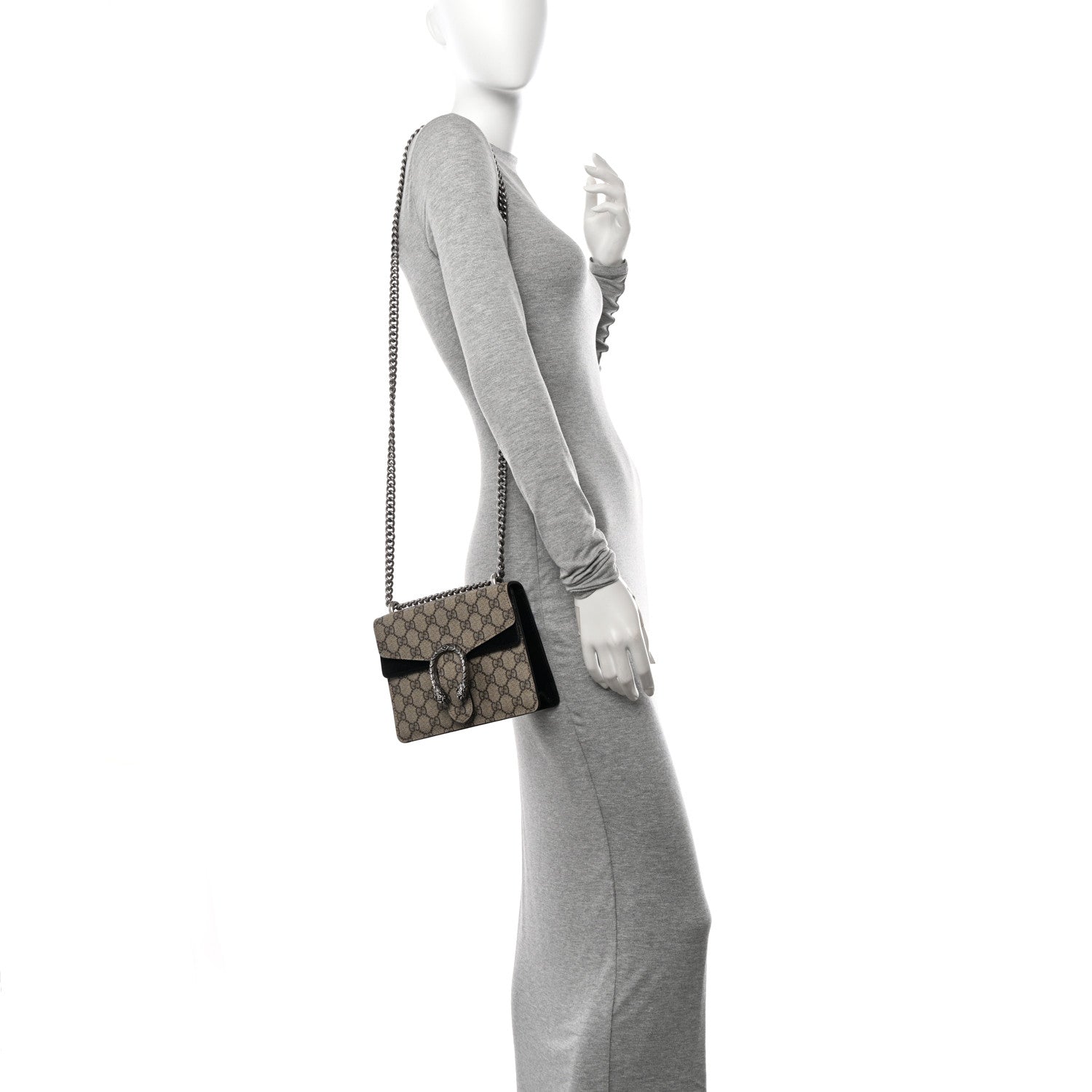 This is an authentic GUCCI GG Supreme Monogram Mini Dionysus Shoulder Bag in Black. This stylish bag is crafted of Gucci GG monogram coated canvas, with black suede leather trim. The shoulder bag features an aged silver chain-link shoulder strap and a textured horseshoe closure with tiger head spurs on the crossover flap. The bag opens to a black suede and coated canvas interior.Follow this item for alerts. Gucci is a registered trademark of Gucci. FASHIONPHILE is not affiliated with Gucci.