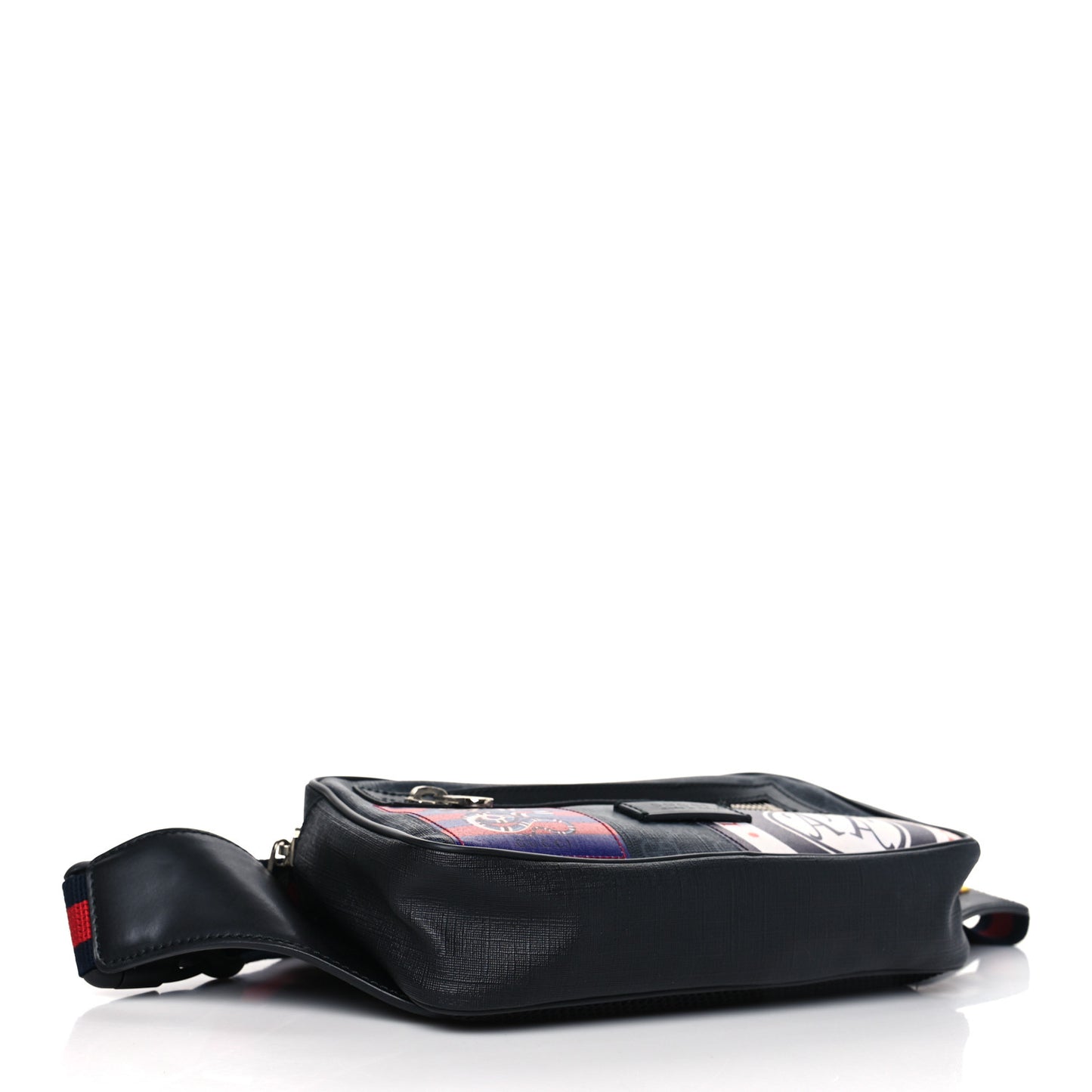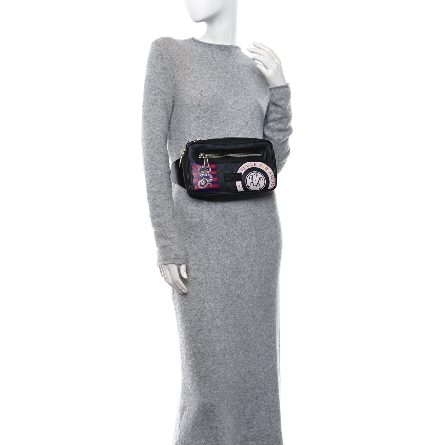 This is an authentic GUCCI GG Supreme Monogram Night Courrier Belt Bag in Black and Multicolor. This stylish messenger bag is crafted of Gucci GG monogram coated canvas in black with smooth black leather accents and features printed and embroidered patches and an adjustable Gucci nylon web belt strap. The zip top opens to a black linen lining with zipper and patch pockets.